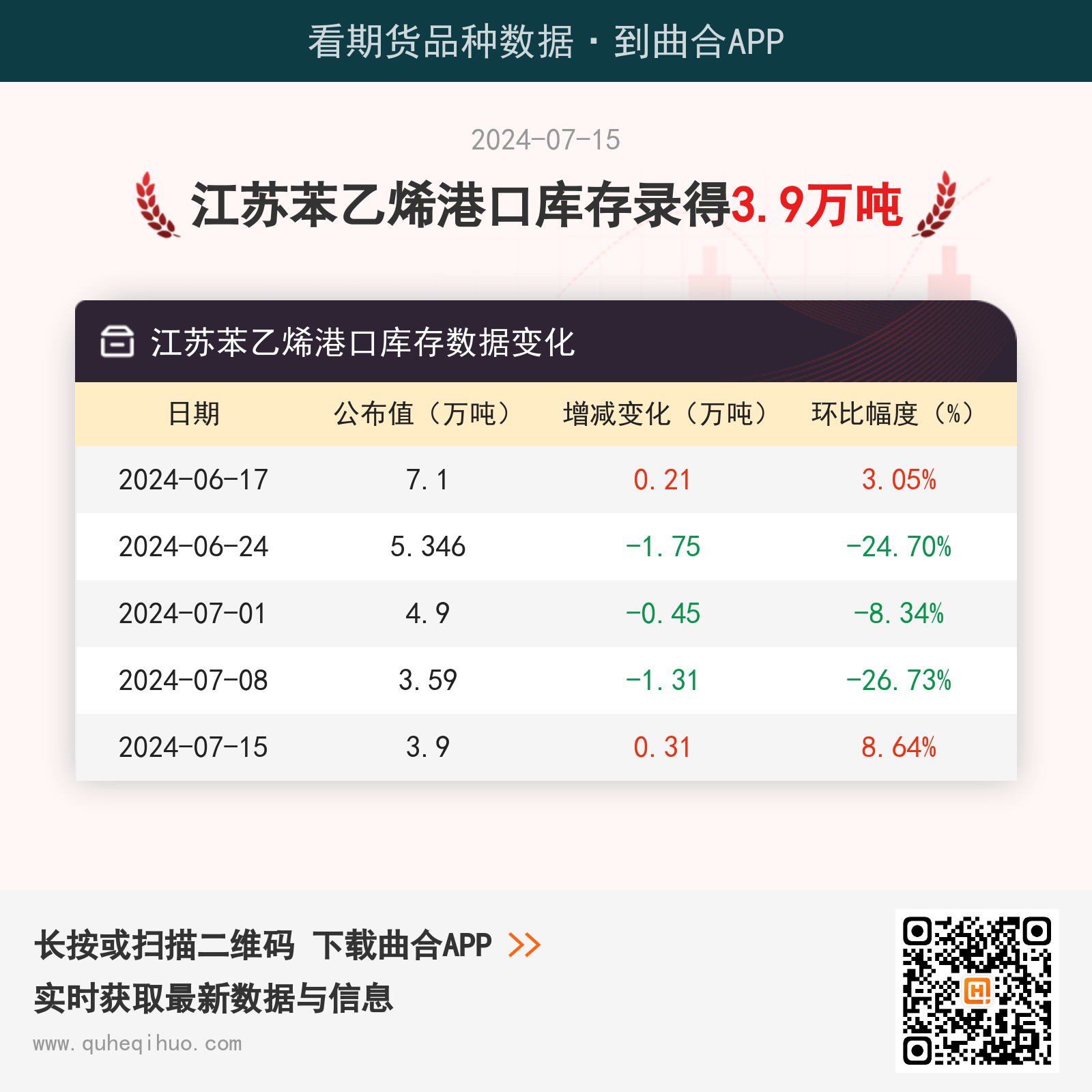 截止7月15日,江苏苯乙烯港口库存数据录得 3.9万吨,较上一周增加0.31万吨,环比涨幅8.64%。