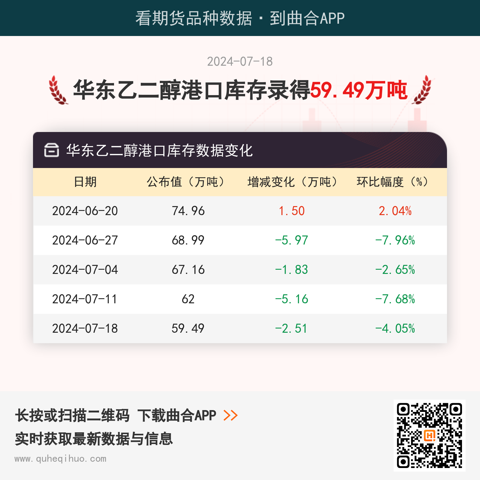 截止7月18日,华东乙二醇港口库存数据为 59.49万吨,较上一统计周期减少2.51万吨,环比跌幅4.05%。