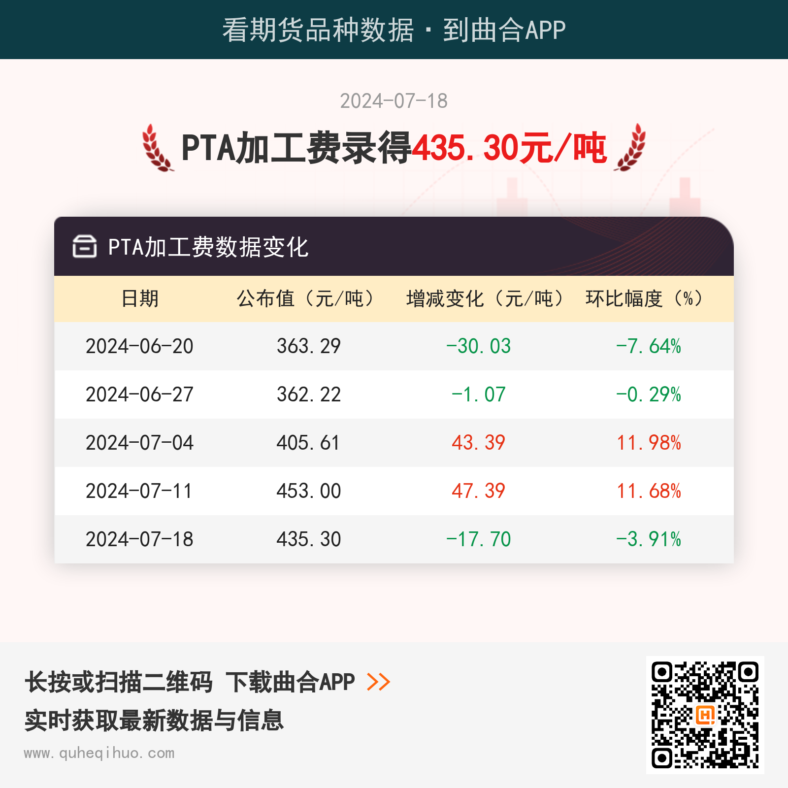 截止7月18日,PTA加工费为 435.30元/吨,较上一周减少17.70元/吨,环比跌幅3.91%。