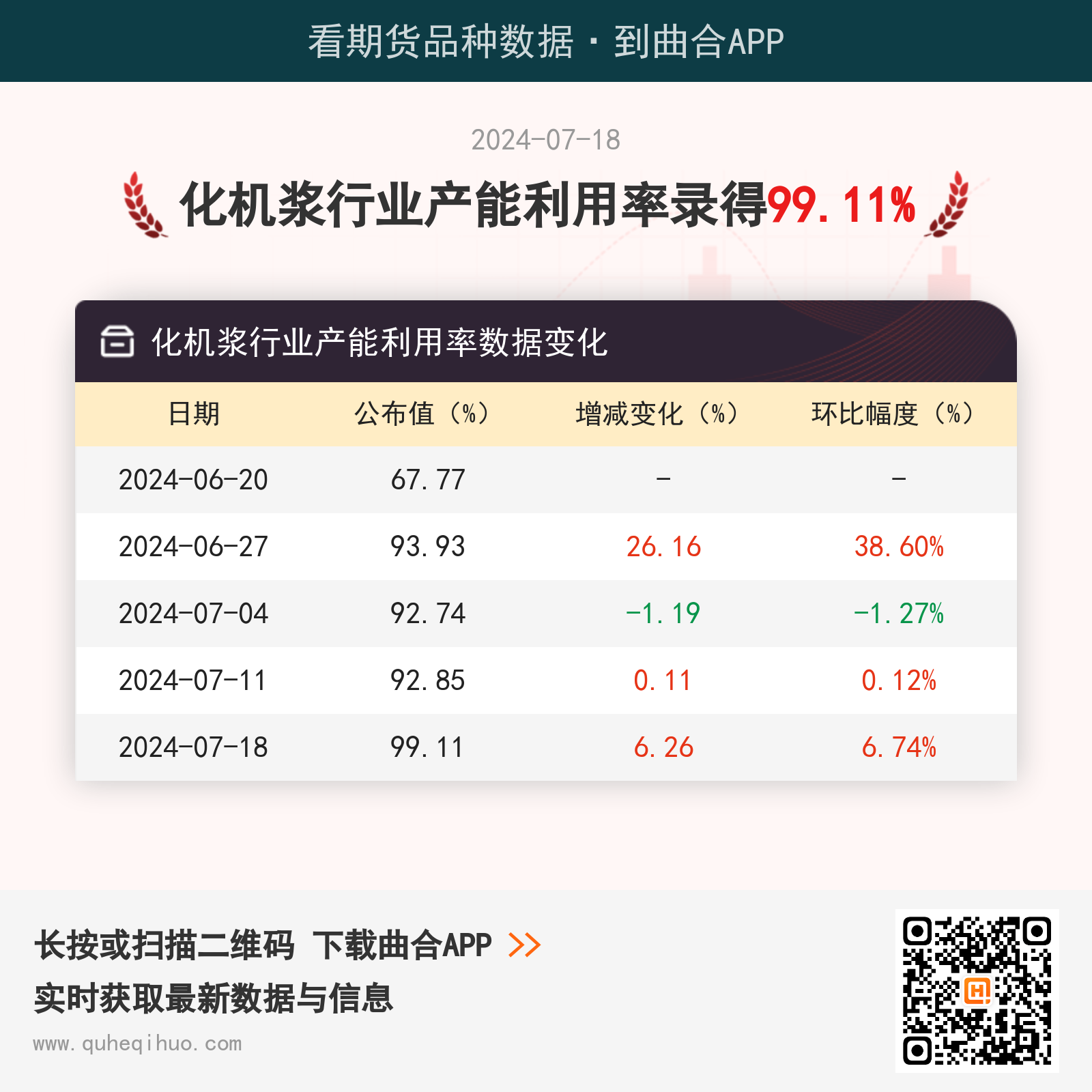 7月18日化机浆行业产能利用率为99.11% 2024年07月18日 | 查看: 54259 截止7月18日,化机浆行业产能利用率为 99.11%,较上一周增加6.26%,环比涨幅6.74%。 近期化机浆行业产能利用率数据变化如下: 图片来源于网络,如有侵权,请联系删除 纸浆期货实时行情 更新时间:---- 最新价 -- 涨跌值 -- 涨跌幅 -- 点击查看纸浆最新行情走势推荐阅读: 人保车险|常见的车险误区多家上市银行去年代销保险保费收入同比增长人保车险|为什么车险选择至关重要?为你解析其中的奥秘! 人保车险|车险到期未续保损失有多大人保车险|车险一个不可忽视的行车保障!人保服务|带你了解财产一切险 人保服务|带你了解财产一切险2024年7月5日丙烯酸羟丙酯价格行情最新价格查询2024年7月5日今日一乙醇胺最新价格查询2024年7月5日最新丁二酸二钠价格行情走势查询 其它推荐 暂无相关文章 关键词: 上一篇:7月18日阔叶浆行业产能利用率为94.83% 下一篇:7月18日化机浆企业产量为21.47万吨