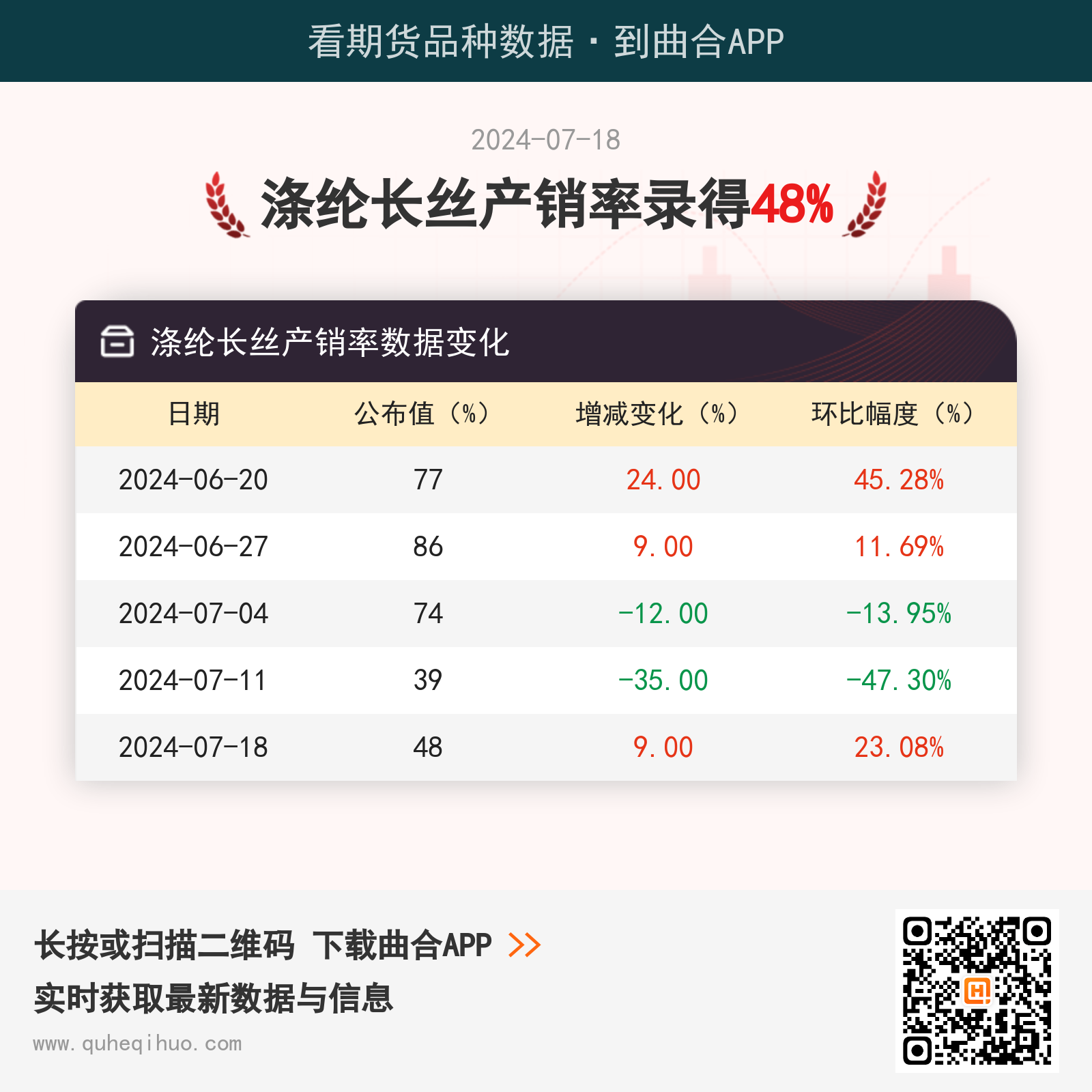 截止7月18日,涤纶长丝产销率录得 48%,较上一周增加9%,环比涨幅23.08%。