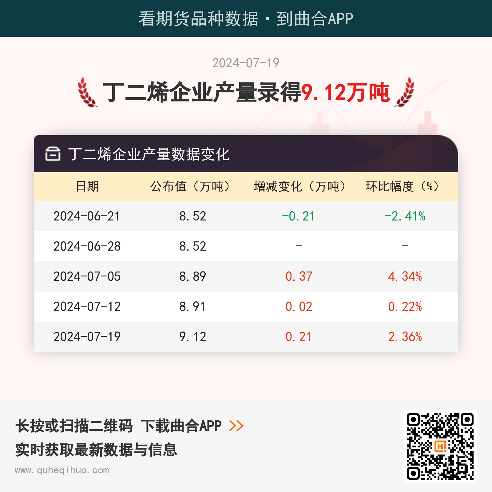 截止7月19日,丁二烯企业产量数据为 9.12万吨,较上一周增加0.21万吨,环比涨幅2.36%。