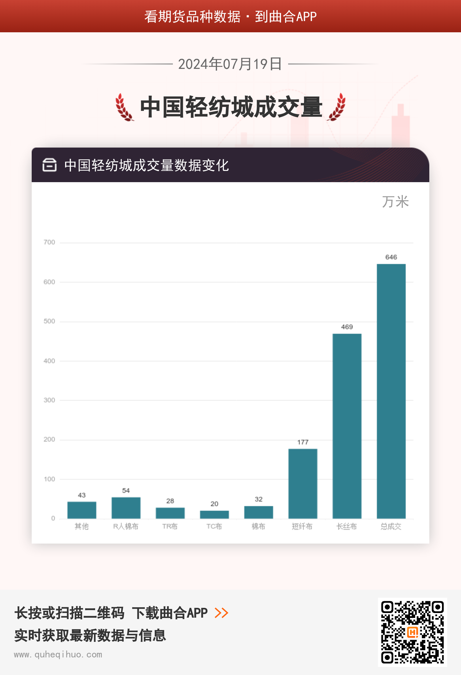 7月19日,其他成交43万米,较上一日减少5万米,环比跌幅10.42%。R人棉布成交54万米,较上一日增加7万米,环比涨幅14.89%。TR布成交28万米,较上一日增加5万米,环比涨幅21.74%。TC布成交20万米,较上一日减少4万米,环比跌幅16.67%。棉布成交32万米,较上一日减少2万米,环比跌幅5.88%。短纤布成交177万米,较上一日增加1万米,环比涨幅0.57%。长丝布成交469万米,较上一日增加31万米,环比涨幅7.08%。总成交成交646万米,较上一日增加32万米,环比涨幅5.21%。