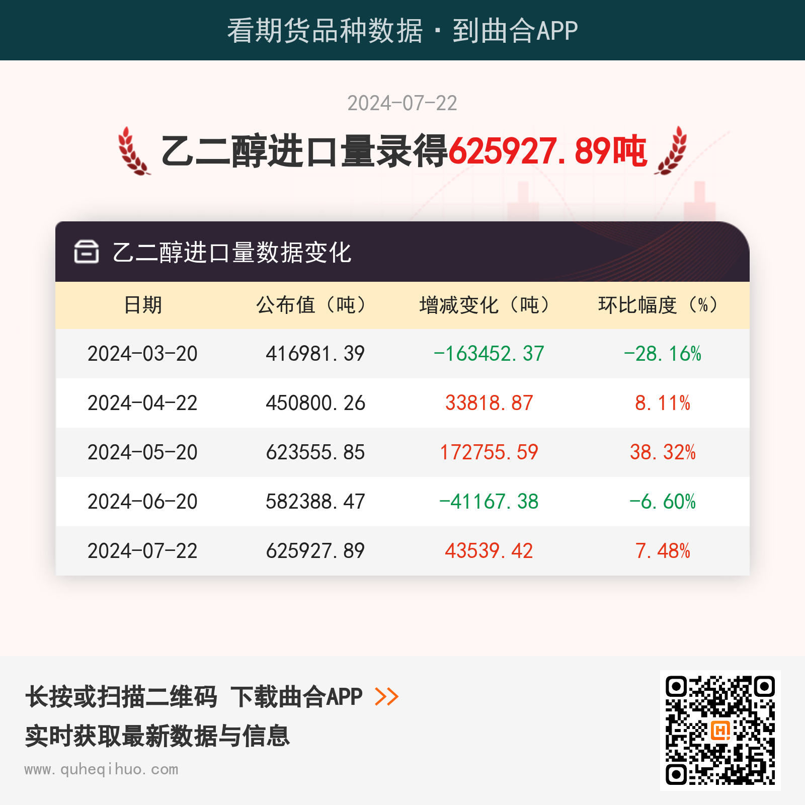 截止7月22日,乙二醇进口量数据为 625927.89吨,较上一月增加43539.42吨,环比涨幅7.48%。