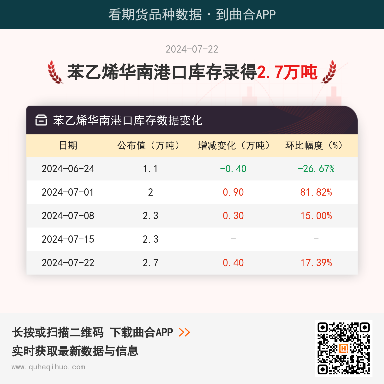 截止7月22日,苯乙烯华南港口库存数据录得 2.7万吨,较上一周增加0.4万吨,环比涨幅17.39%。