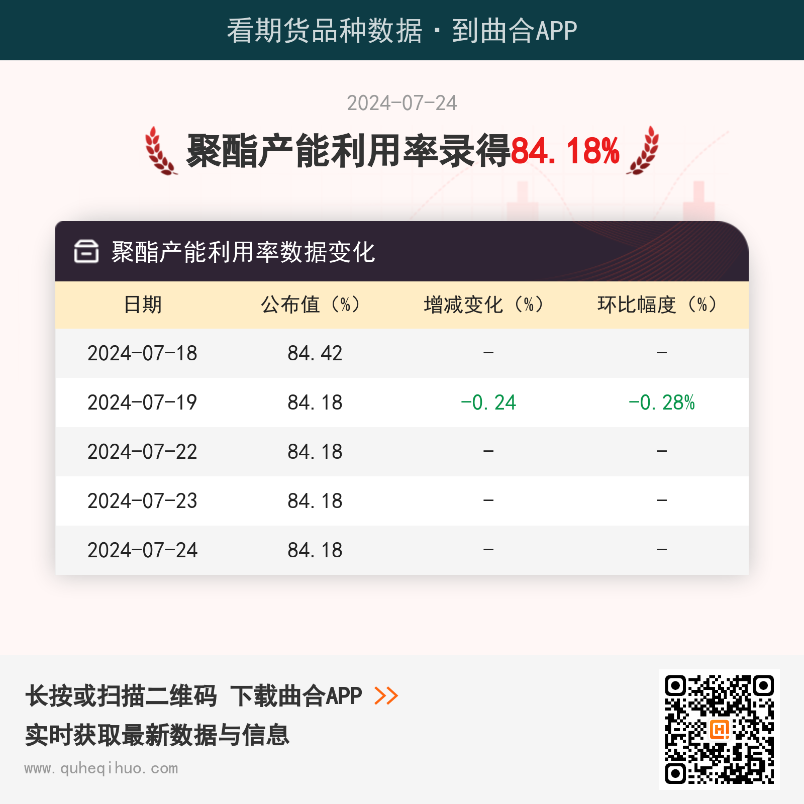 7月24日,聚酯产能利用率录得 84.18%,较上一日减少0.00%,环比跌幅0.00%。