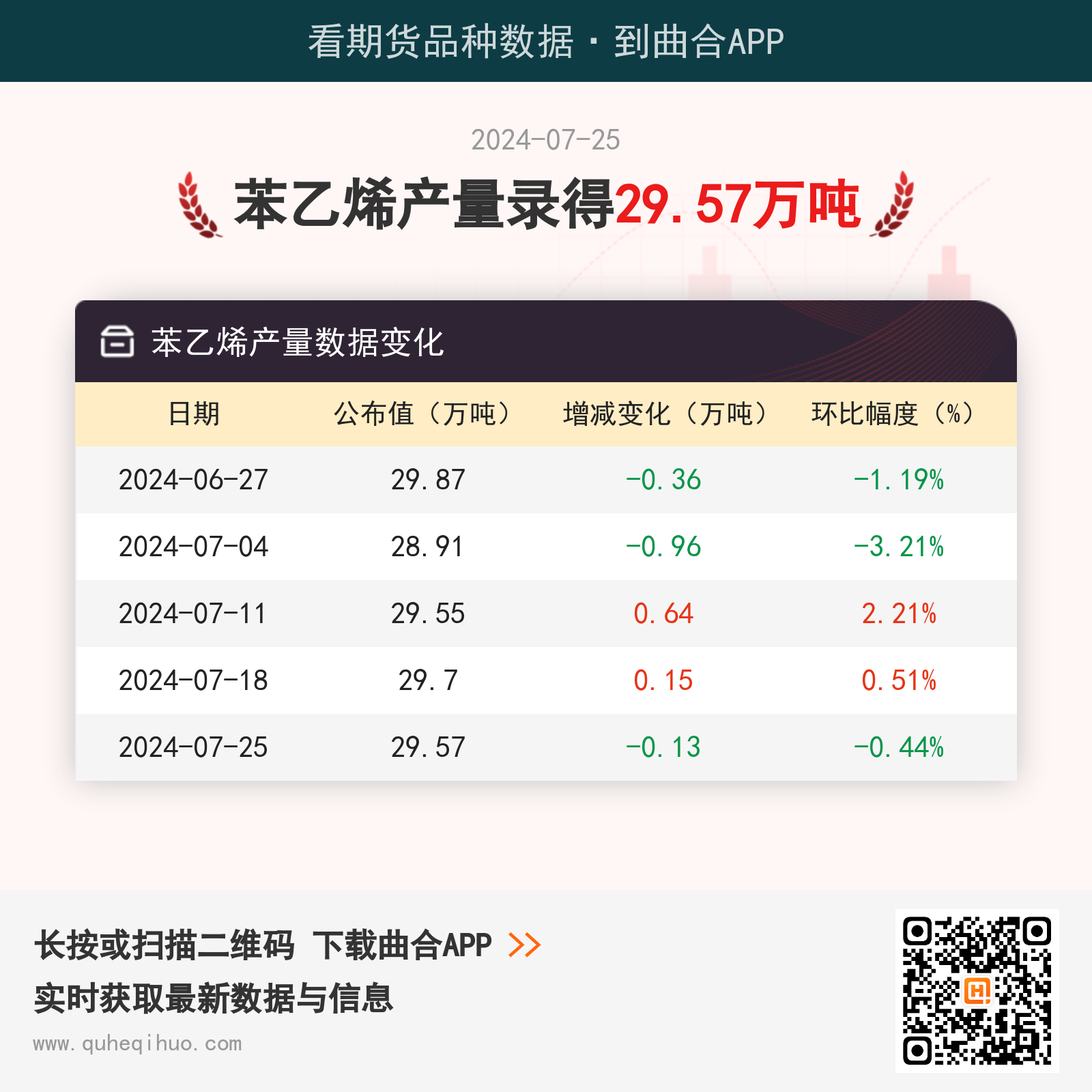 截止7月25日,苯乙烯产量数据录得 29.57万吨,较上一周减少0.13万吨,环比跌幅0.44%。