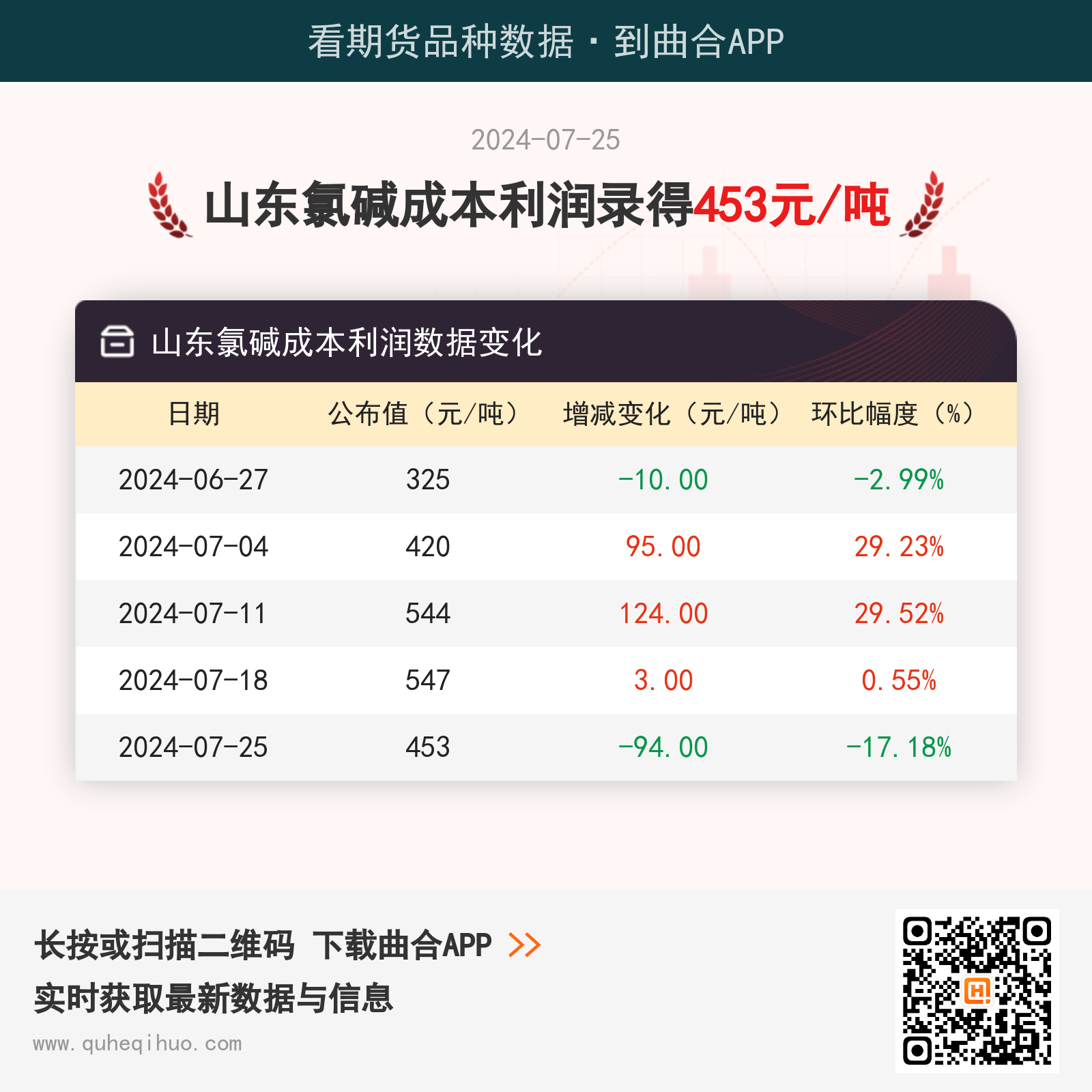 7月25日山东氯碱成本利润453元/吨 2024年07月25日 | 查看: 49715 截止7月25日,山东氯碱成本利润数据录得 453元/吨,较上一周减少94元/吨,环比跌幅17.18%。图片来源于网络,如有侵权,请联系删除 近期山东氯碱成本利润数据变化如下: 烧碱期货实时行情 更新时间:---- 最新价 -- 涨跌值 -- 涨跌幅 -- 点击查看烧碱最新行情走势 其它推荐 暂无相关文章 关键词: 上一篇:7月25日聚乙烯企业产能利用率为75.89% 下一篇:【库存】7月26日PVC库存数据公布