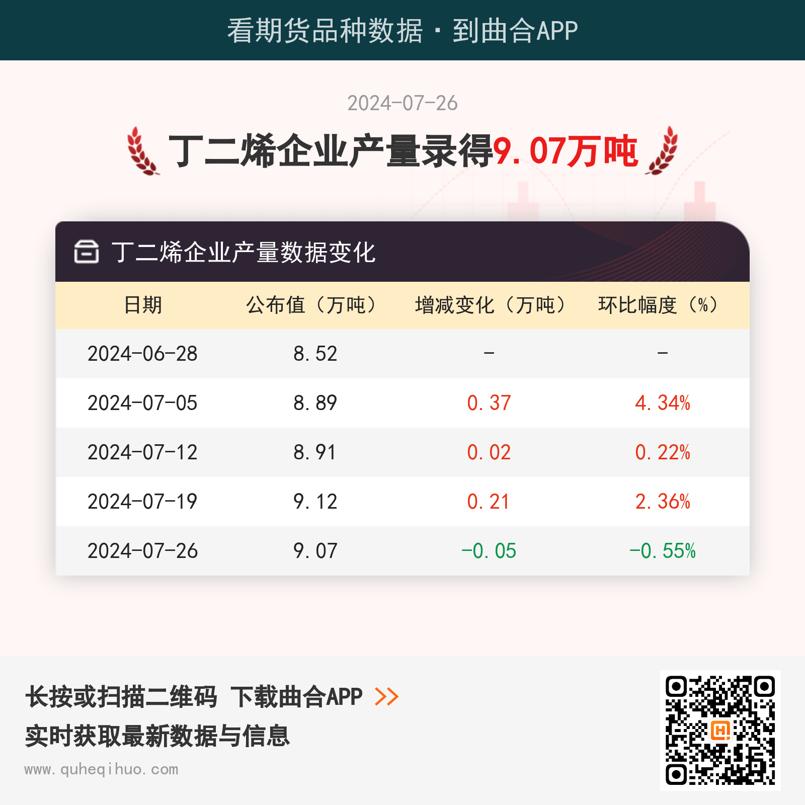 7月26日丁二烯企业产量9.07万吨 2024年07月26日 | 查看: 77816 截止7月26日,丁二烯企业产量数据为 9.07万吨,较上一周减少0.05万吨,环比跌幅0.55%。图片来源于网络,如有侵权,请联系删除 近期丁二烯企业产量数据变化如下: 橡胶期货实时行情 更新时间:---- 最新价 -- 涨跌值 -- 涨跌幅 -- 点击查看橡胶最新行情走势 其它推荐 暂无相关文章 关键词: 上一篇:(2024年7月26日)今日天然橡胶期货最新价格行情查询 下一篇:2024年7月26日环己烷价格行情今日报价查询
