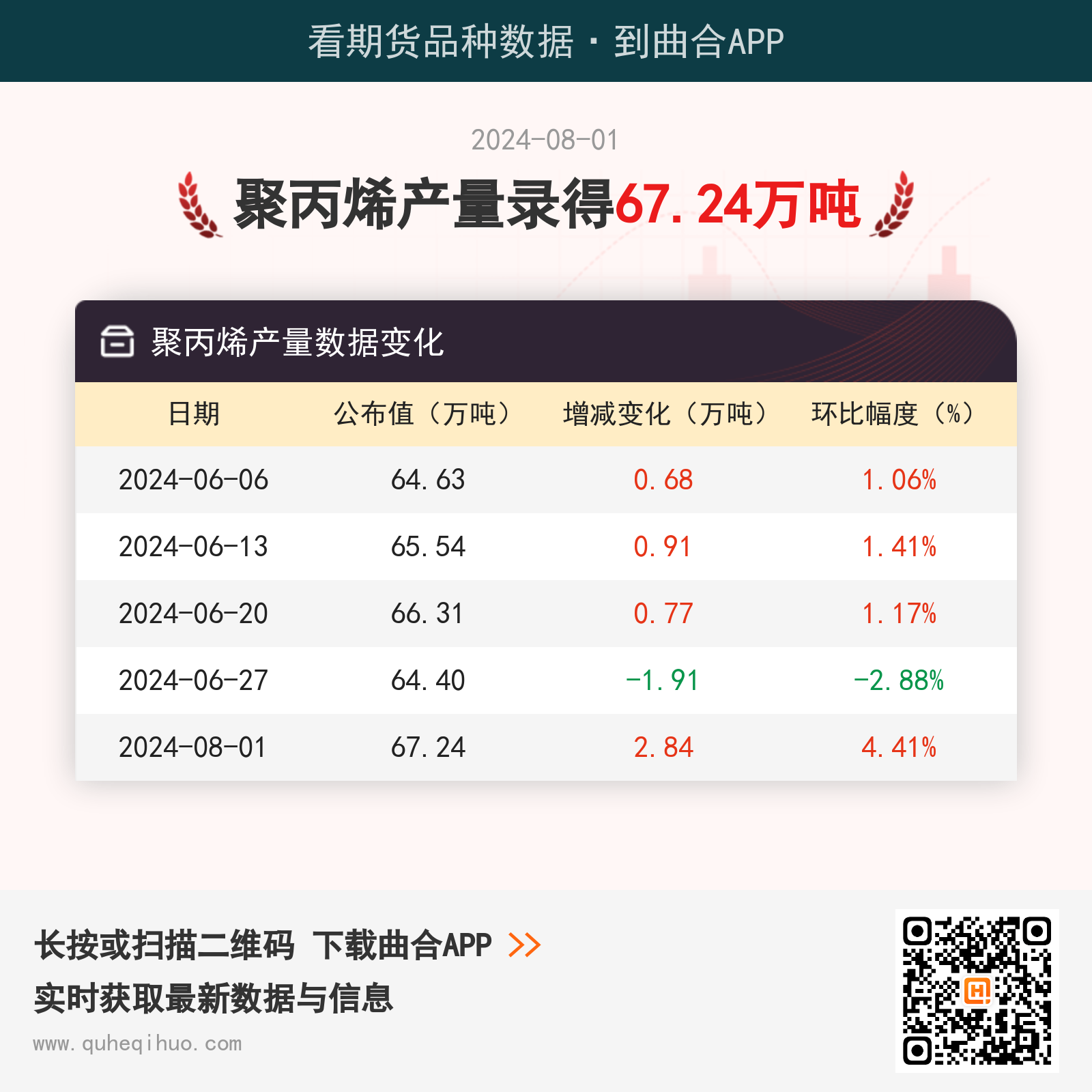 8月1日聚丙烯产量为67.24万吨 2024年08月01日 | 查看: 65314 截止8月1日,聚丙烯产量为 67.24万吨,较上一周增加2.84万吨,环比涨幅4.41%。图片来源于网络,如有侵权,请联系删除 近期聚丙烯产量数据变化如下: 图片来源于网络,如有侵权,请联系删除 聚丙烯期货实时行情 更新时间:---- 最新价 -- 涨跌值 -- 涨跌幅 -- 点击查看聚丙烯最新行情走势 其它推荐 暂无相关文章 关键词: 上一篇:8月1甲醇期货持仓龙虎榜分析:空方离场情绪强于多方 下一篇:8月1日聚丙烯产能利用率为75.32%