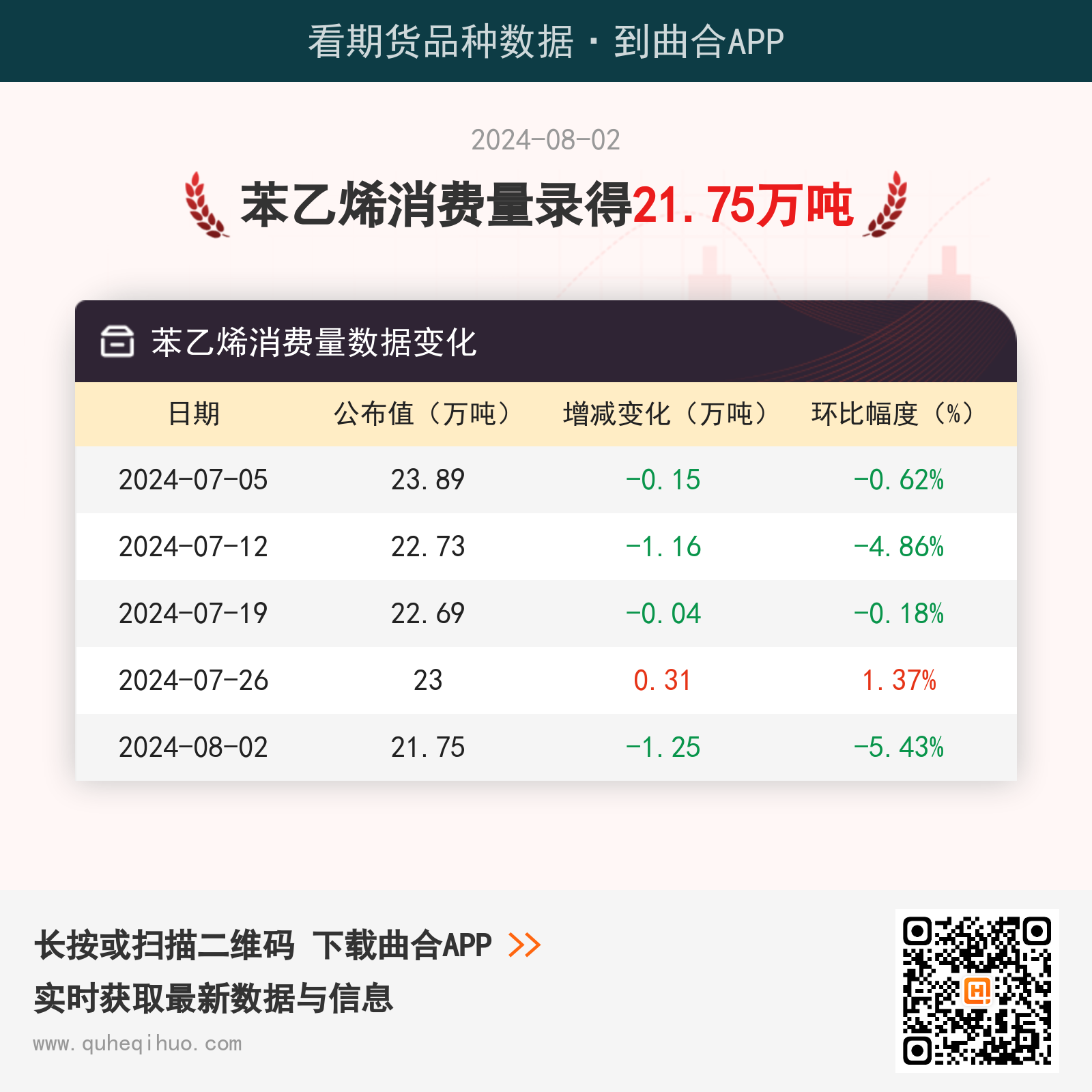 截止8月2日,苯乙烯消费量数据录得 21.75万吨,较上一周减少1.25万吨,环比跌幅5.43%。