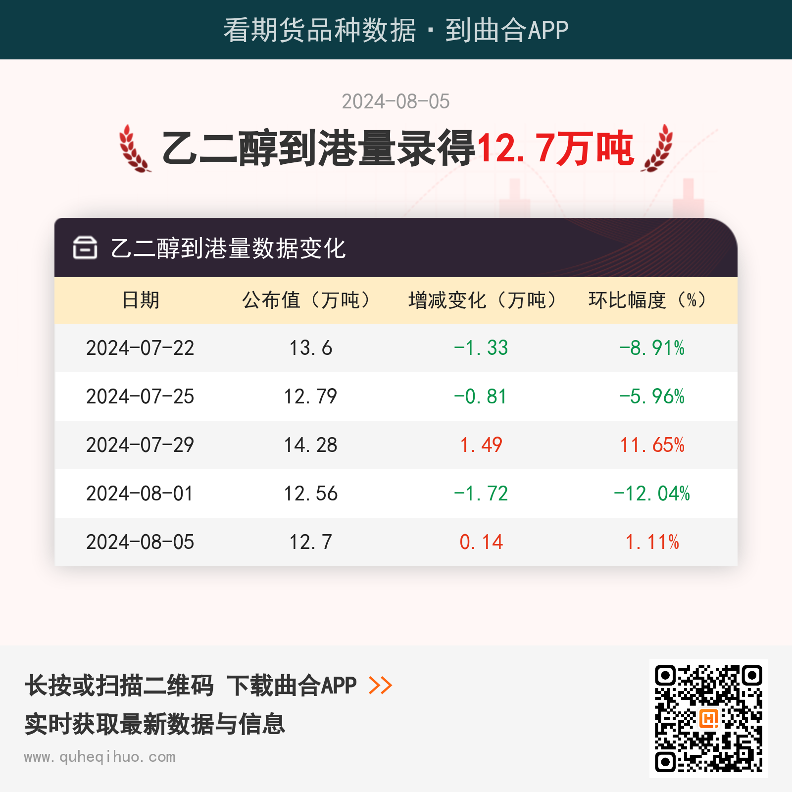 8月5日乙二醇到港量12.7万吨 2024年08月05日 | 查看: 62010 截止8月5日,乙二醇到港量数据为 12.7万吨,较上一次增加0.14万吨,环比涨幅1.11%。 近期乙二醇到港量数据变化如下:图片来源于网络,如有侵权,请联系删除 乙二醇期货实时行情 更新时间:---- 最新价 -- 涨跌值 -- 涨跌幅 -- 点击查看乙二醇最新行情走势 其它推荐 暂无相关文章 关键词: 上一篇:2024年8月5今日对二甲苯最新价格多少钱一吨 下一篇:2024年8月5日最新N,N-二甲基对甲苯胺价格行情走势查询