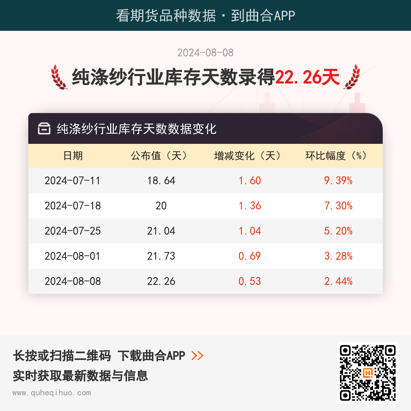 8月8日纯涤纱行业库存天数为22.26天 2024年08月08日 | 查看: 62824 截止8月8日,纯涤纱行业库存天数数据为 22.26天,较上一周增加0.53天,环比涨幅2.44%。 近期纯涤纱行业库存天数数据变化如下:图片来源于网络,如有侵权,请联系删除 短纤期货实时行情 更新时间:---- 最新价 -- 涨跌值 -- 涨跌幅 -- 点击查看短纤最新行情走势 其它推荐 暂无相关文章 关键词: 上一篇:【玻璃库存】8月8日浮法玻璃企业库存6735.6万重箱 下一篇:8月8日织造企业开工率为53.12%
