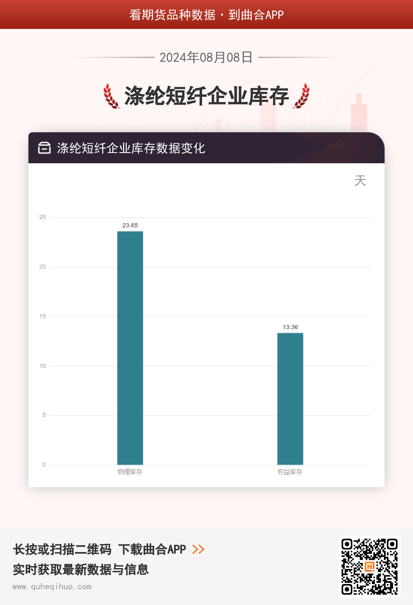 截止8月8日,涤纶短纤企业物理库存 23.65天,较上一周增加0.73天,环比涨幅3.18%。涤纶短纤企业权益库存 13.36天,较上一周增加0.25天,环比涨幅1.91%。