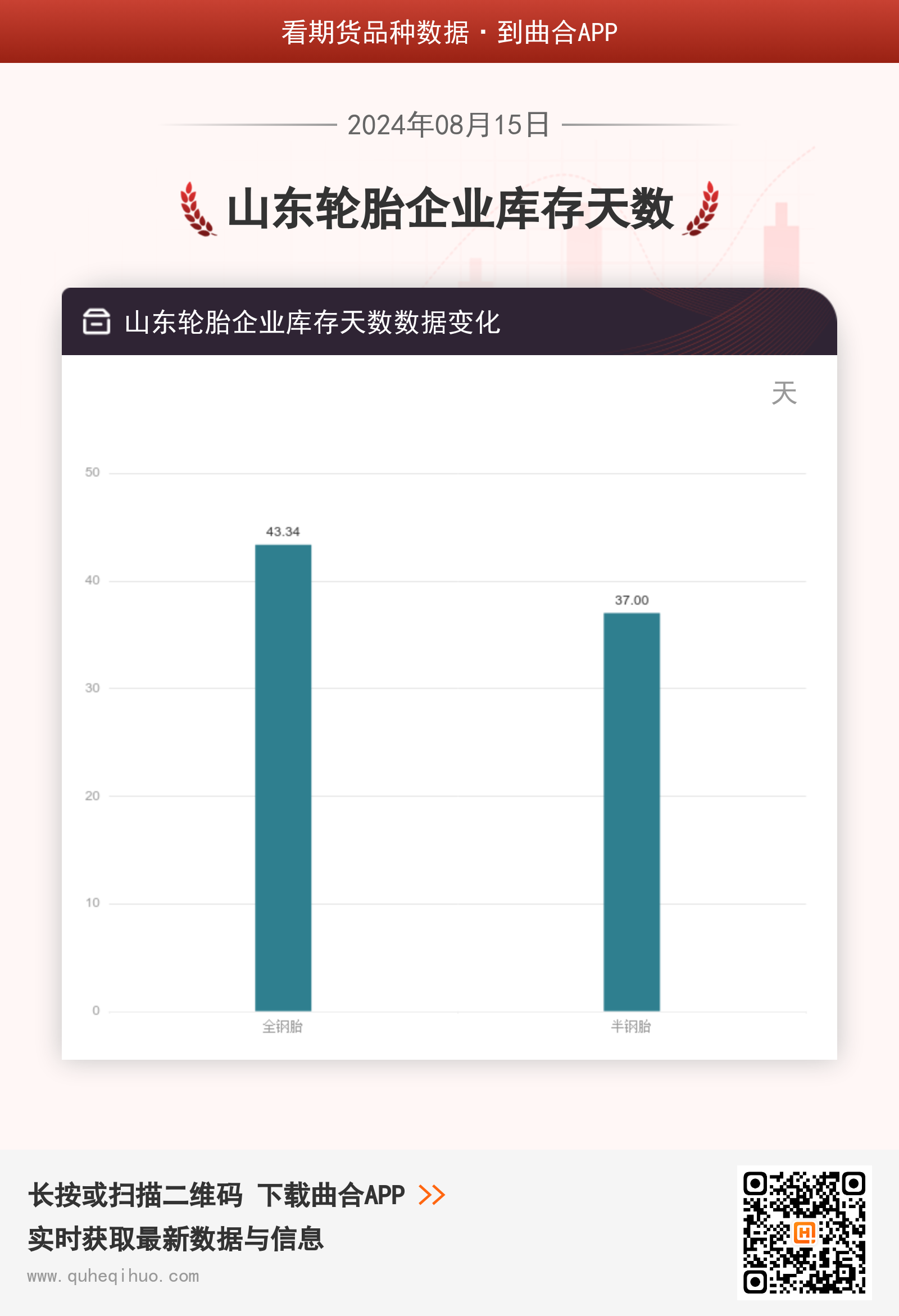 截止8月15日,全钢胎库存天数为 43.34天,较上一周增加0.31天,环比涨幅0.72%。半钢胎库存天数为 37.00天,较上一周增加0.05天,环比涨幅0.14%。