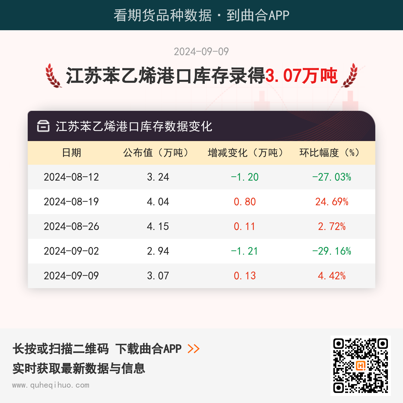 截止9月9日,江苏苯乙烯港口库存数据录得 3.07万吨,较上一周增加0.13万吨,环比涨幅4.42%。