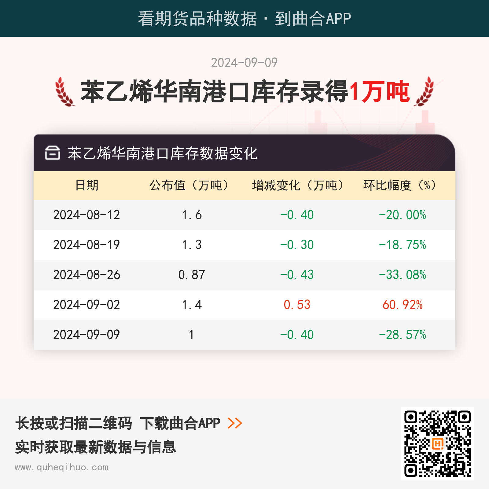 截止9月9日,苯乙烯华南港口库存数据录得 1万吨,较上一周减少0.4万吨,环比跌幅28.57%。