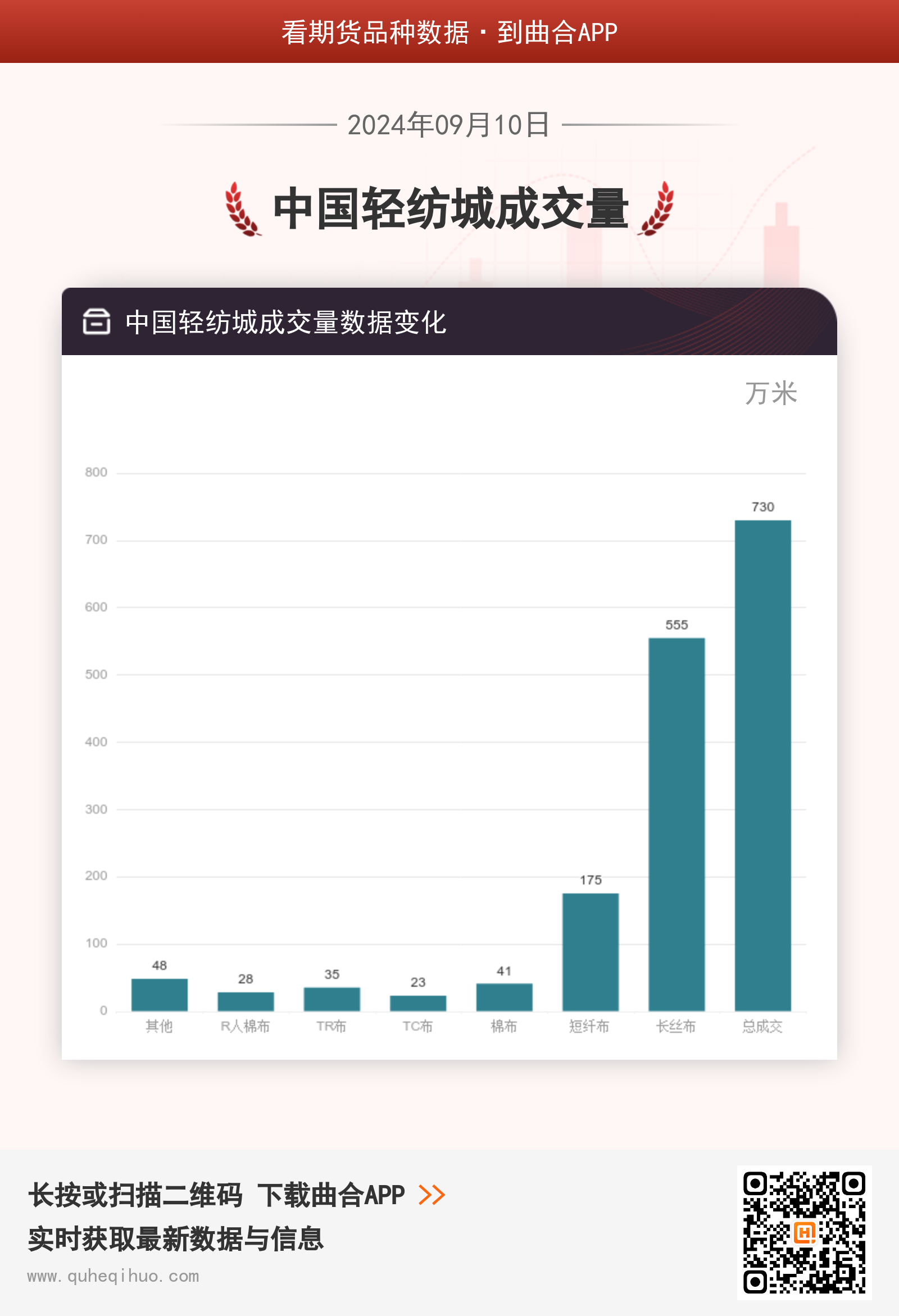 9月10日,其他成交48万米,较上一日增加12万米,环比涨幅33.33%。R人棉布成交28万米,较上一日增加3万米,环比涨幅12.00%。TR布成交35万米,较上一日增加3万米,环比涨幅9.38%。TC布成交23万米,较上一日增加4万米,环比涨幅21.05%。棉布成交41万米,较上一日增加4万米,环比涨幅10.81%。短纤布成交175万米,较上一日增加26万米,环比涨幅17.45%。长丝布成交555万米,较上一日减少72万米,环比跌幅11.48%。总成交成交730万米,较上一日减少46万米,环比跌幅5.93%。