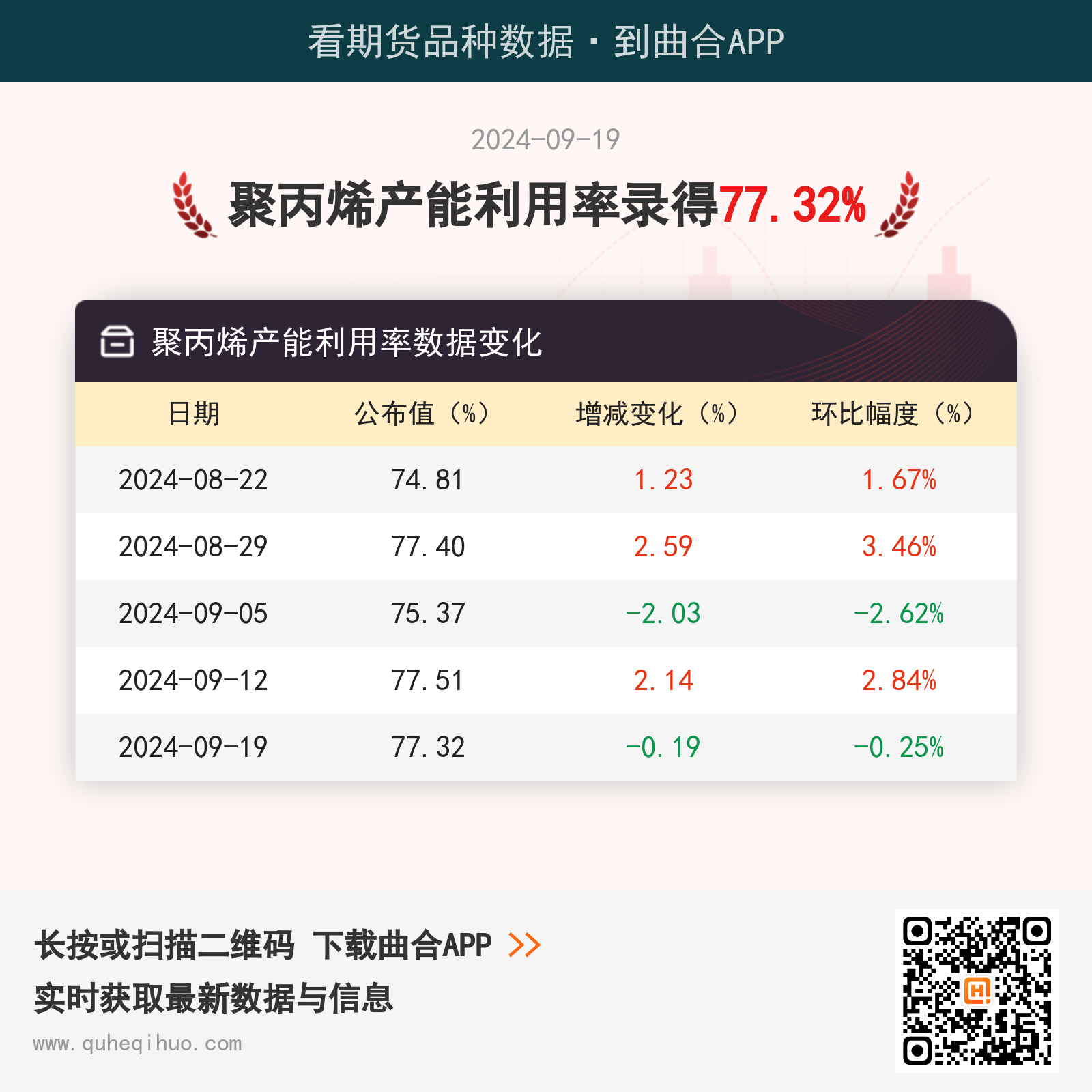 9月19日聚丙烯产能利用率为77.32% 2024年09月19日 | 查看: 54771 截止9月19日,聚丙烯产能利用率为 77.32%,较上一周减少0.19%,环比跌幅0.25%。 近期聚丙烯产能利用率数据变化如下:图片来源于网络,如有侵权,请联系删除 聚丙烯期货实时行情 更新时间:---- 最新价 -- 涨跌值 -- 涨跌幅 -- 点击查看聚丙烯最新行情走势 其它推荐 暂无相关文章 关键词: 上一篇:9月19日尿素期货持仓龙虎榜分析:空方呈进场态势 下一篇:9月19日涤纶短纤企业库存天数
