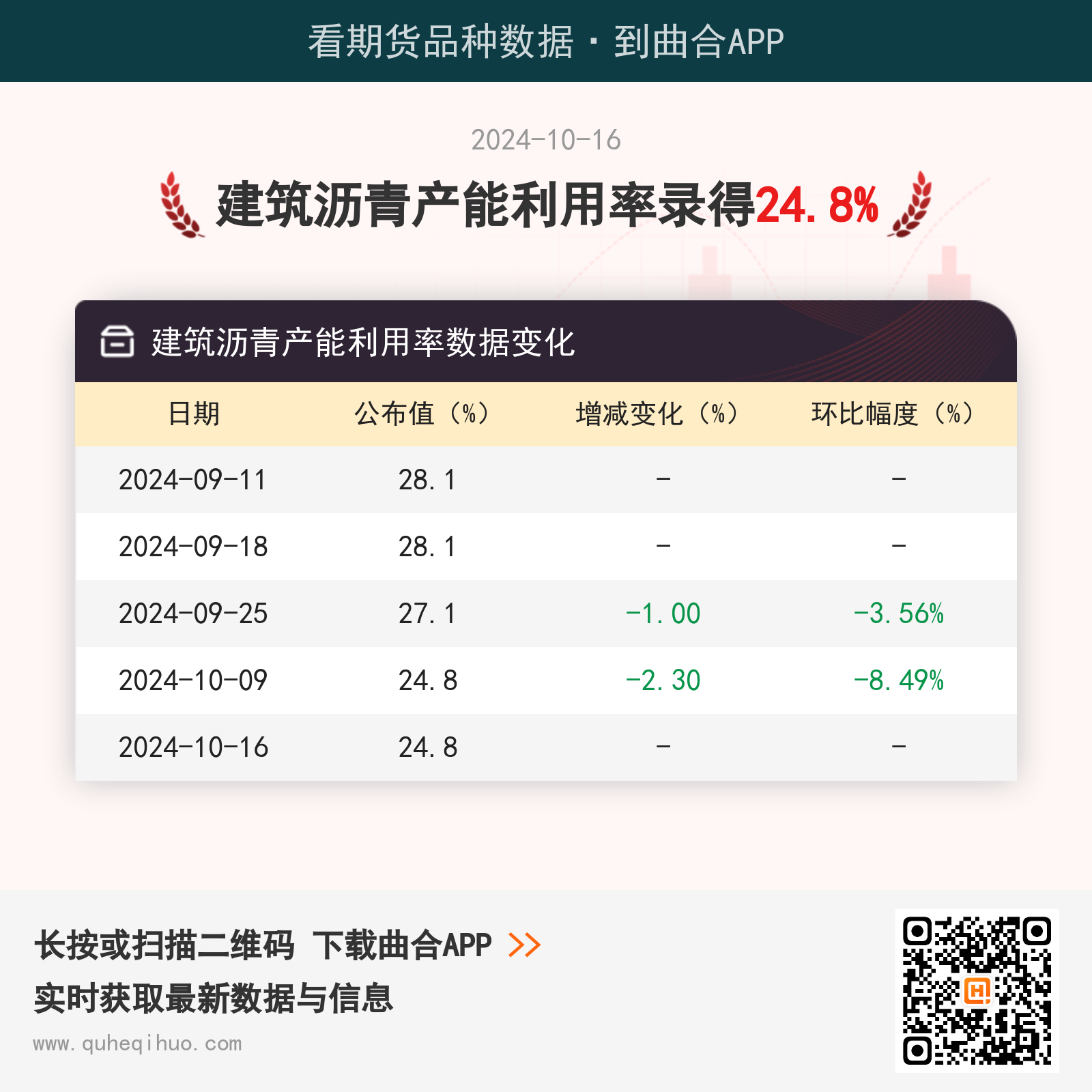 截止10月16日,建筑沥青产能利用率数据为 24.8%,较上一周减少0.0%,环比跌幅0.00%。