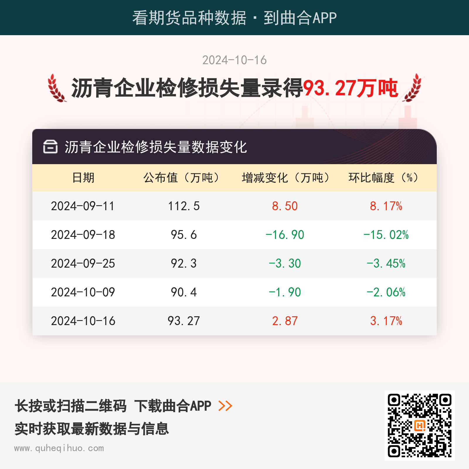 10月16日沥青企业检修损失量93.27万吨 2024年10月16日 | 查看: 84059 截止10月16日,沥青企业检修损失量数据为 93.27万吨,较上一周增加2.87万吨,环比涨幅3.17%。 近期沥青企业检修损失量数据变化如下:图片来源于网络,如有侵权,请联系删除 沥青期货实时行情 更新时间:---- 最新价 -- 涨跌值 -- 涨跌幅 -- 点击查看沥青最新行情走势 其它推荐 暂无相关文章 关键词: 上一篇:10月16日建筑沥青产能利用率为24.8% 下一篇:10月16日尿素企业预收订单天数为9.41日