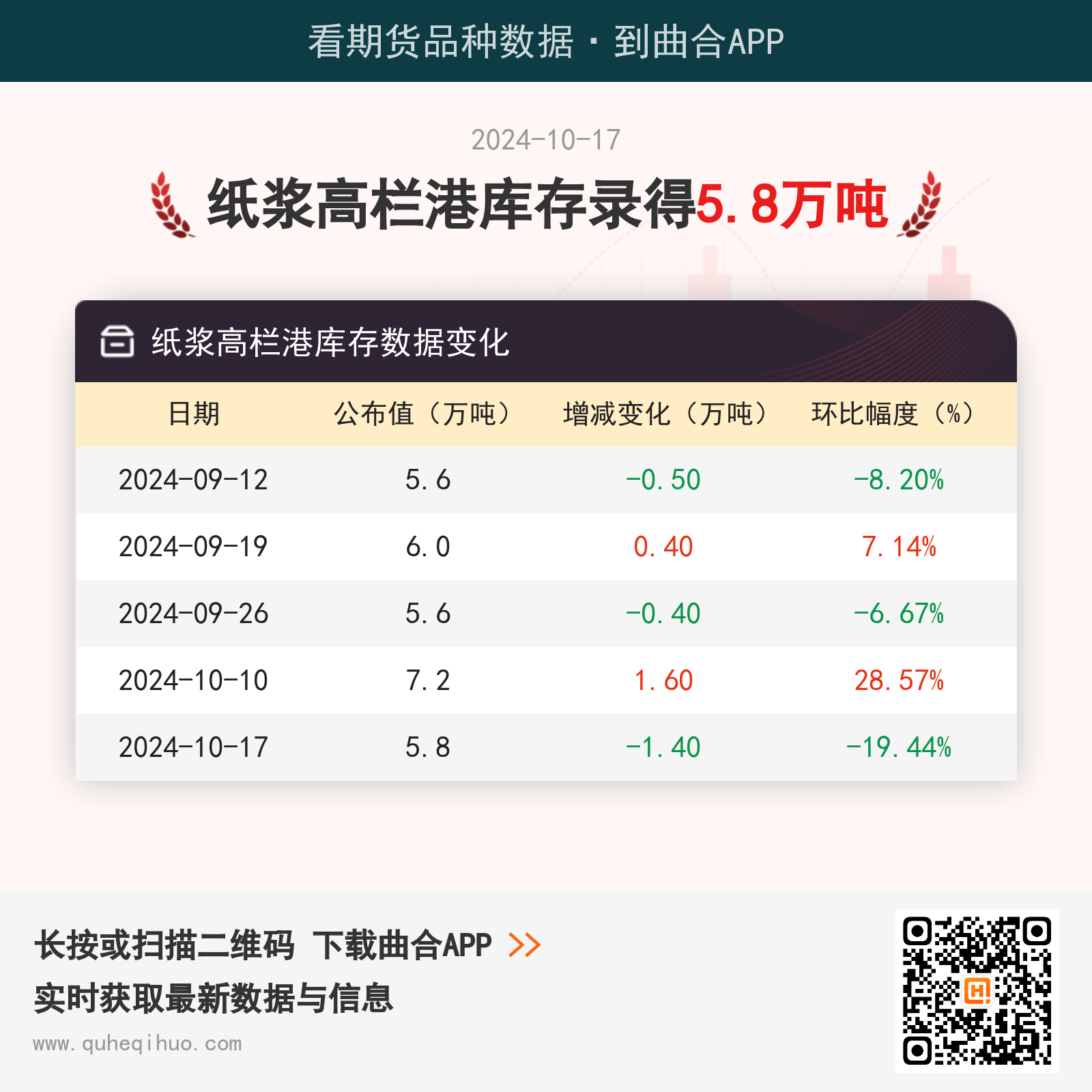 【库存】10月17日纸浆高栏港库存为5.8万吨 2024年10月17日 | 查看: 57128 截止10月17日,纸浆高栏港库存数据录得 5.8万吨,较上一周减少1.4万吨,环比跌幅19.44%。图片来源于网络,如有侵权,请联系删除 近期纸浆高栏港库存数据变化如下: 纸浆期货实时行情 更新时间:---- 最新价 -- 涨跌值 -- 涨跌幅 -- 点击查看纸浆最新行情走势 其它推荐 暂无相关文章 关键词: 上一篇:瓶片主力跌幅超1% 供应过剩问题仍未解决 下一篇:【产量】10月17日苯乙烯产量录得30.13万吨