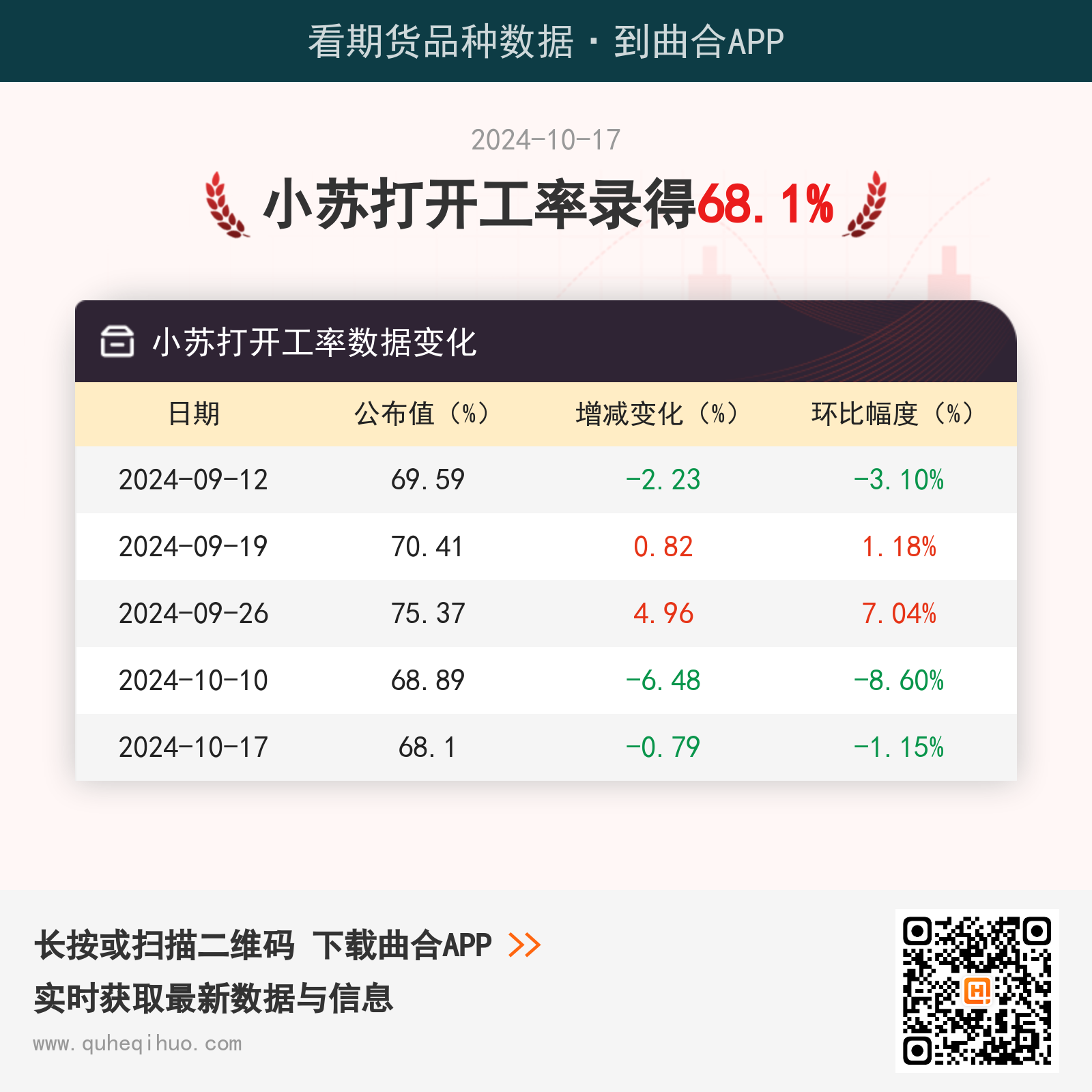 10月17日小苏打开工率数据录得68.1% 2024年10月17日 | 查看: 71962 截止10月17日,小苏打开工率数据录得 68.1%,较上一周减少0.79%,环比跌幅1.15%。 近期小苏打开工率数据变化如下:图片来源于网络,如有侵权,请联系删除 纯碱期货实时行情 更新时间:---- 最新价 -- 涨跌值 -- 涨跌幅 -- 点击查看纯碱最新行情走势 其它推荐 暂无相关文章 关键词: 上一篇:10月17日苯乙烯产能利用率为67.7% 下一篇:10月17日乙二醇需求量为52.66吨