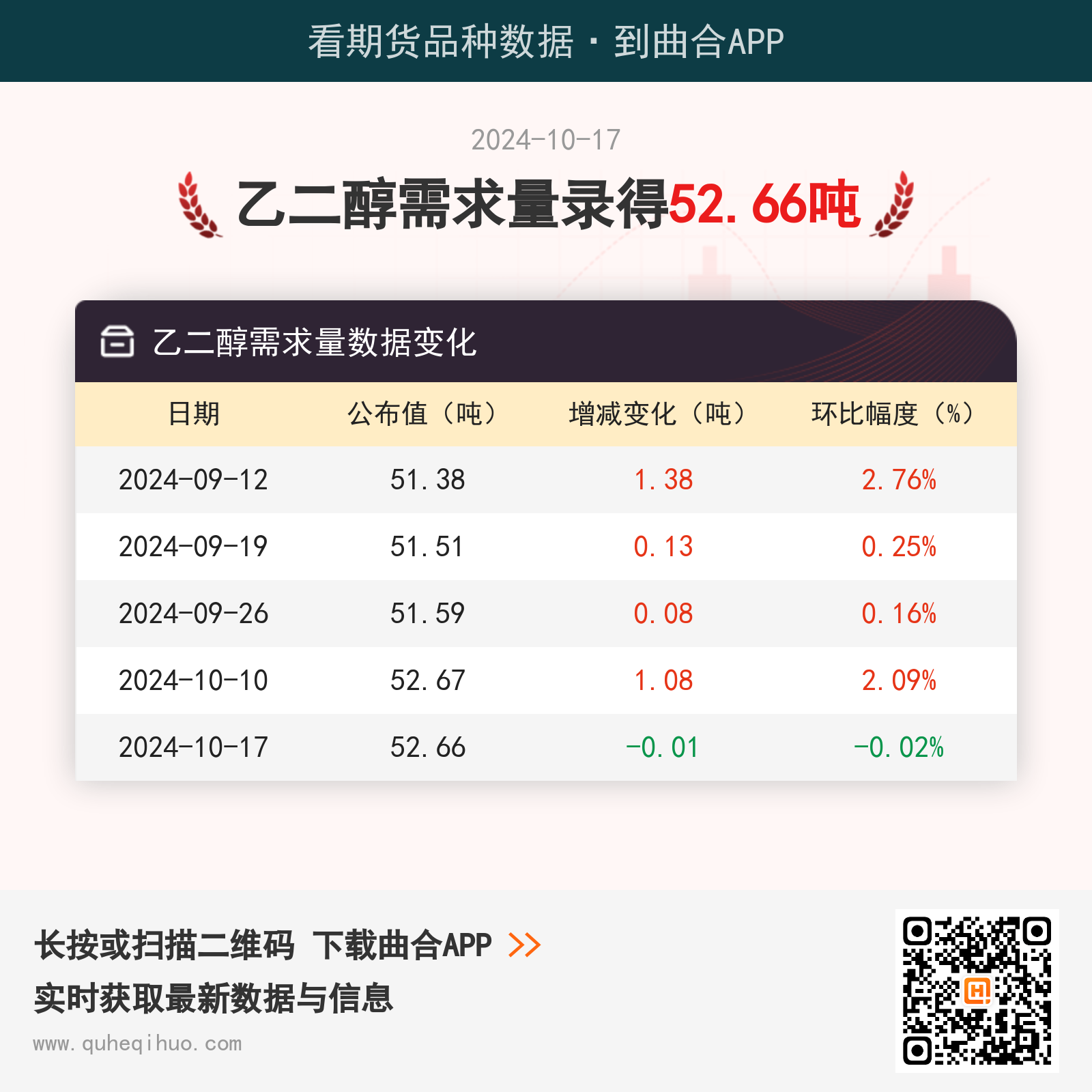 截止10月17日,乙二醇需求量数据为 52.66吨,较上一周减少0.01吨,环比跌幅0.02%。