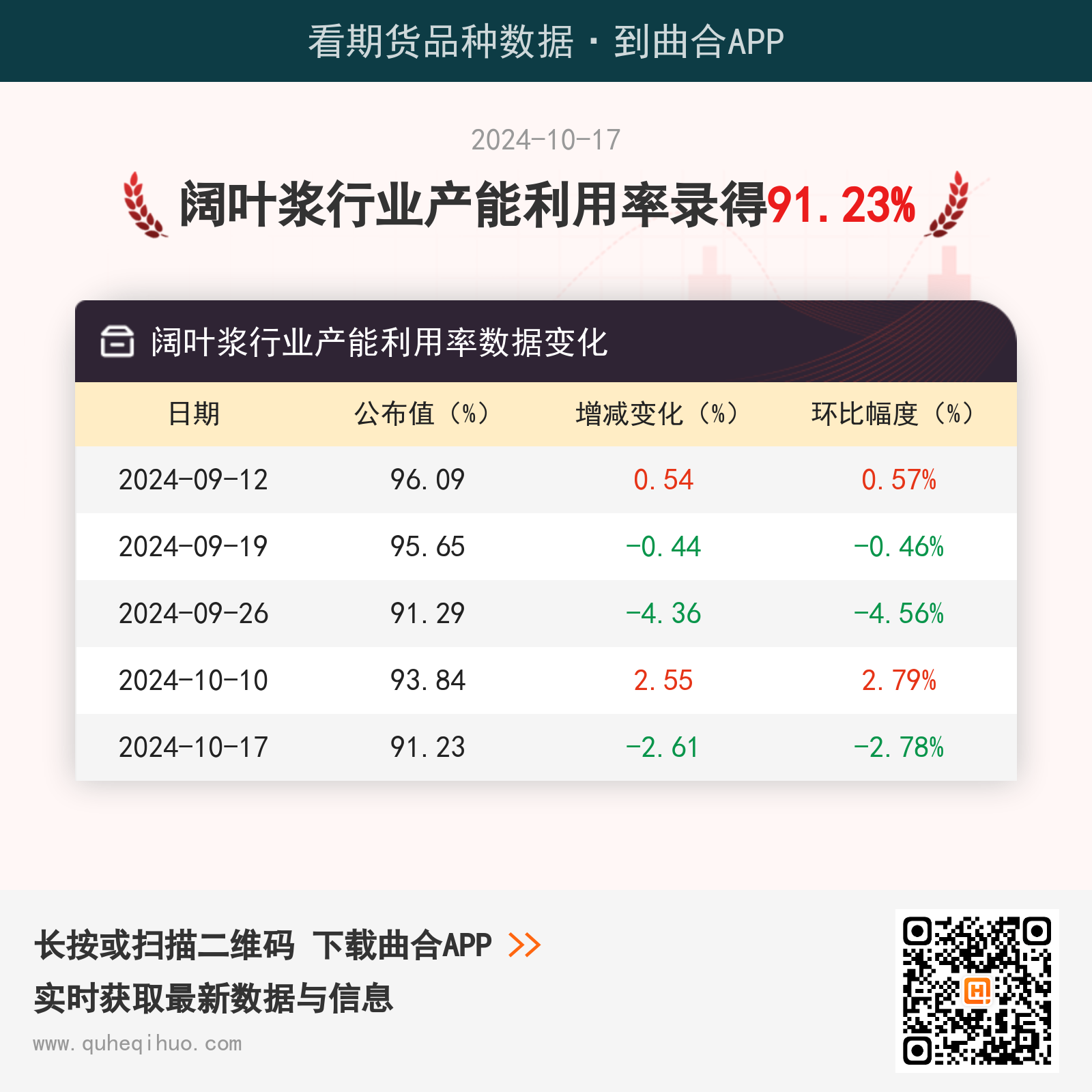 截止10月17日,阔叶浆行业产能利用率为 91.23%,较上一周减少2.61%,环比跌幅2.78%。