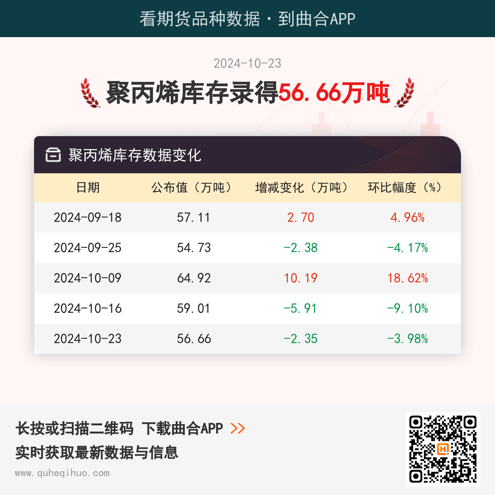 截止10月23日,聚丙烯库存数据录得 56.66万吨,较上一周减少2.35万吨,环比跌幅3.98%。