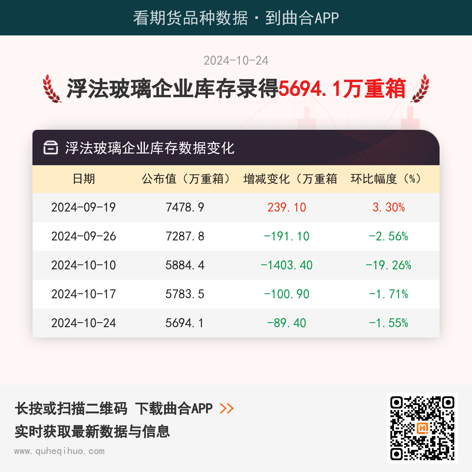 【玻璃库存】10月24日浮法玻璃企业库存5694.1万重箱 2024年10月24日 | 查看: 71042 截止10月24日,浮法玻璃企业库存数据为 5694.1万重箱,较上一周减少89.4万重箱,环比跌幅1.55%。图片来源于网络,如有侵权,请联系删除 近期浮法玻璃企业库存数据变化如下: 玻璃期货实时行情 更新时间:---- 最新价 -- 涨跌值 -- 涨跌幅 -- 点击查看玻璃最新行情走势 其它推荐 暂无相关文章 关键词: 上一篇:10月24日苯乙烯产能利用率为70.38% 下一篇:2024年10月24日今日正戊醛价格最新行情走势