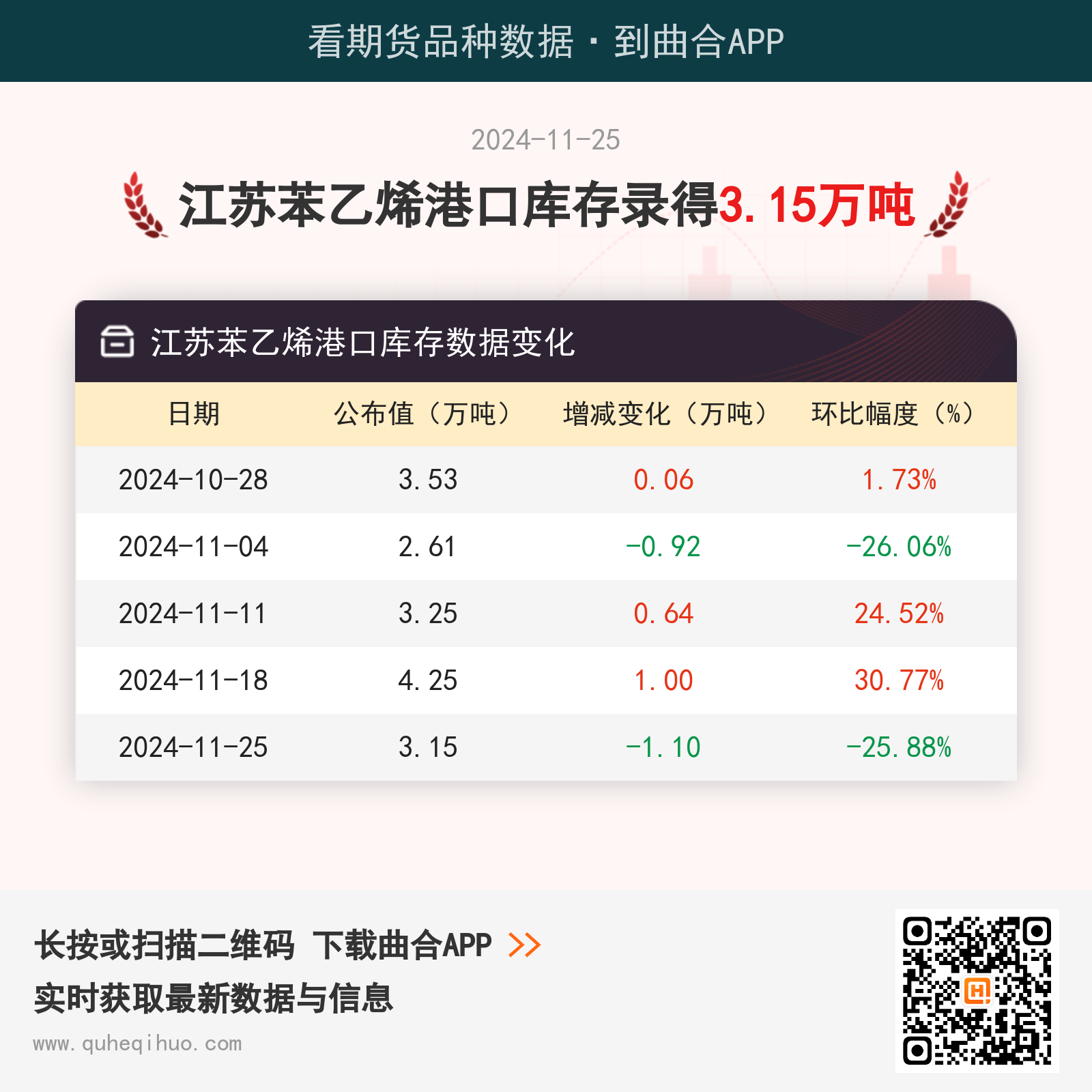 【库存】11月25日江苏苯乙烯港口库存录得3.15万吨 2024年11月25日 | 查看: 73454 截止11月25日,江苏苯乙烯港口库存数据录得 3.15万吨,较上一周减少1.10万吨,环比跌幅25.88%。 近期江苏苯乙烯港口库存数据变化如下: 图片来源于网络,如有侵权,请联系删除 苯乙烯期货实时行情 更新时间:---- 最新价 -- 涨跌值 -- 涨跌幅 -- 点击查看苯乙烯最新行情走势 其它推荐 暂无相关文章 关键词: 上一篇:成本端支撑不足 预计后市短纤将维持震荡调整 下一篇:2024年11月25日今日珠碱价格最新行情走势