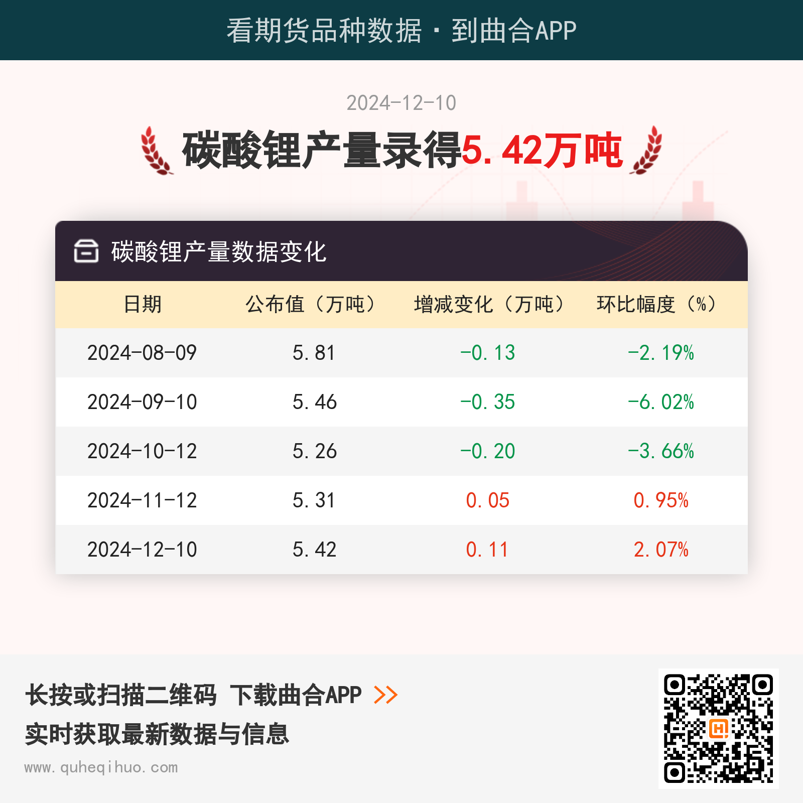 截止12月10日,碳酸锂产量数据录得 5.42万吨,较上一月增加0.11万吨,环比涨幅2.07%。