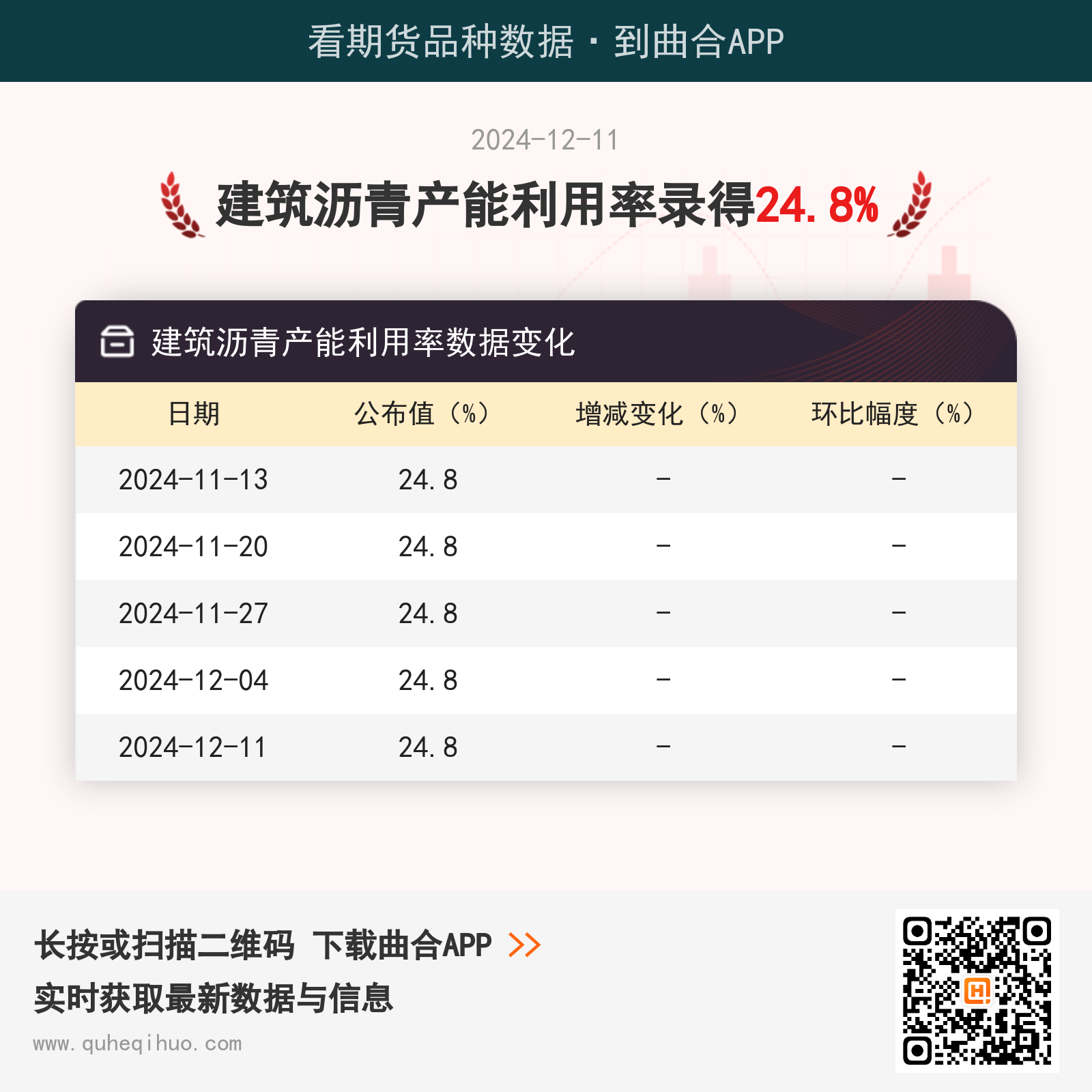 截止12月11日,建筑沥青产能利用率数据为 24.8%,较上一周减少0.0%,环比跌幅0.00%。