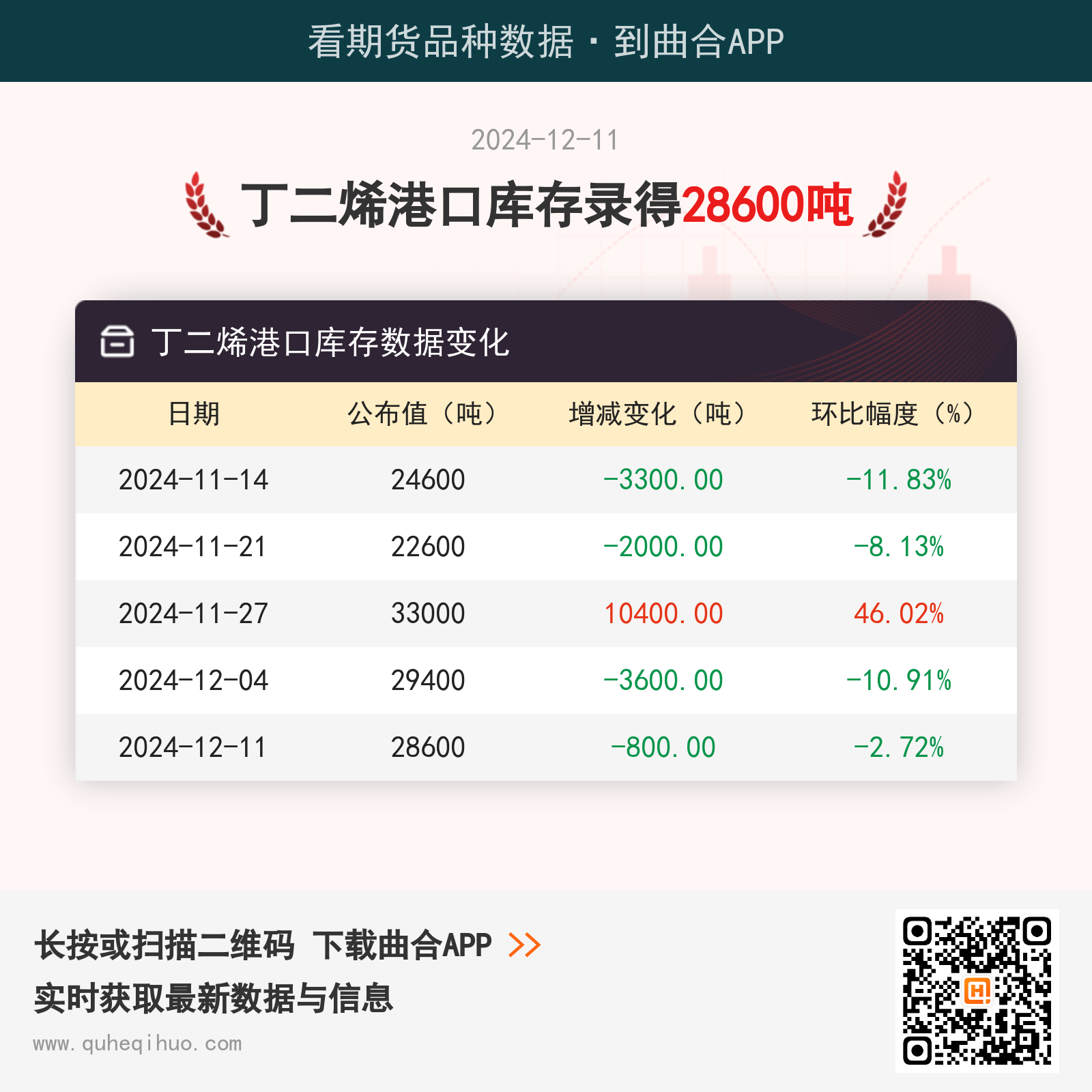 截止12月11日,丁二烯港口库存数据为 28600吨,较上一周减少800吨,环比跌幅2.72%。