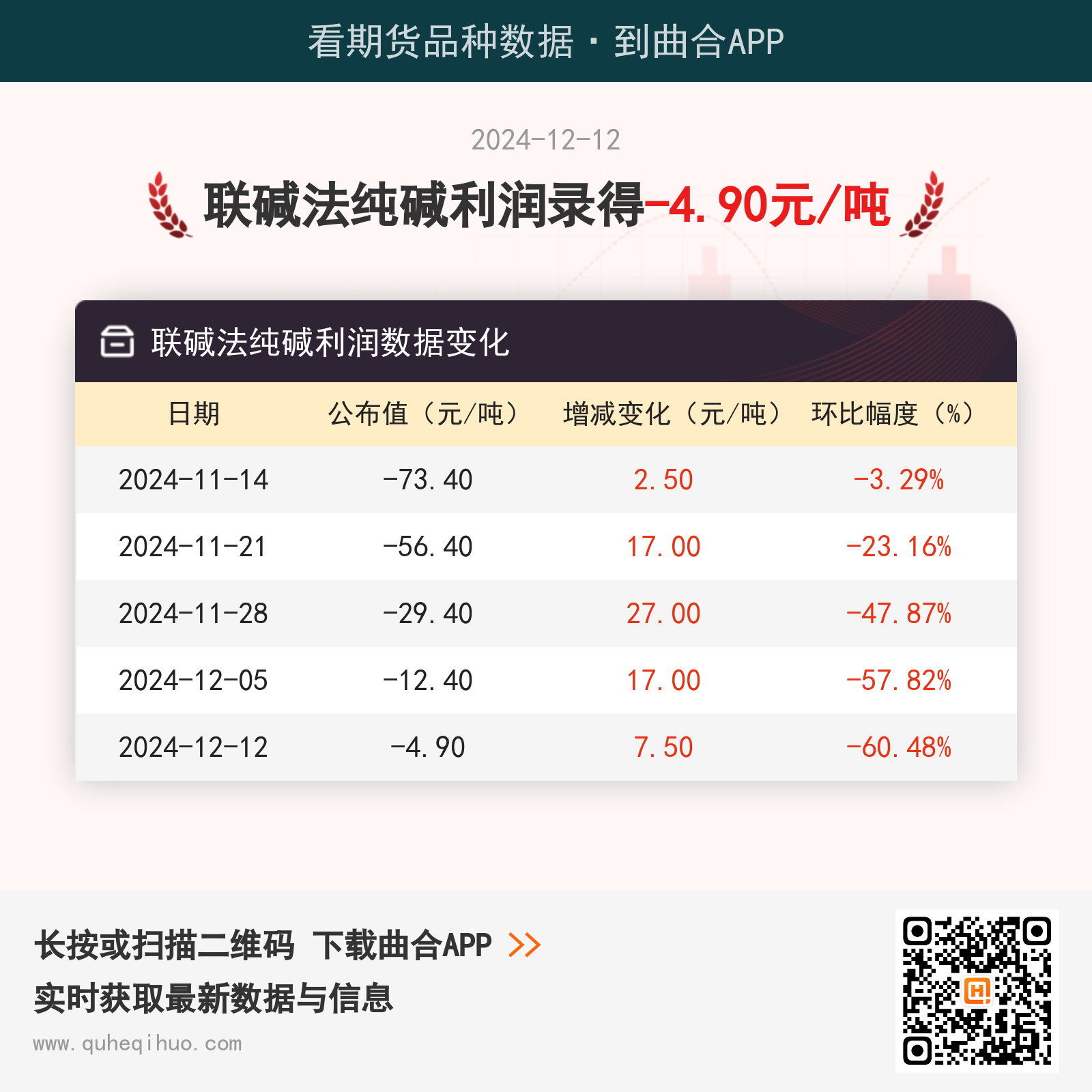 截止12月12日,联碱法纯碱利润数据为 -4.90元/吨,较上一周增加7.50元/吨,环比涨幅60.48%。