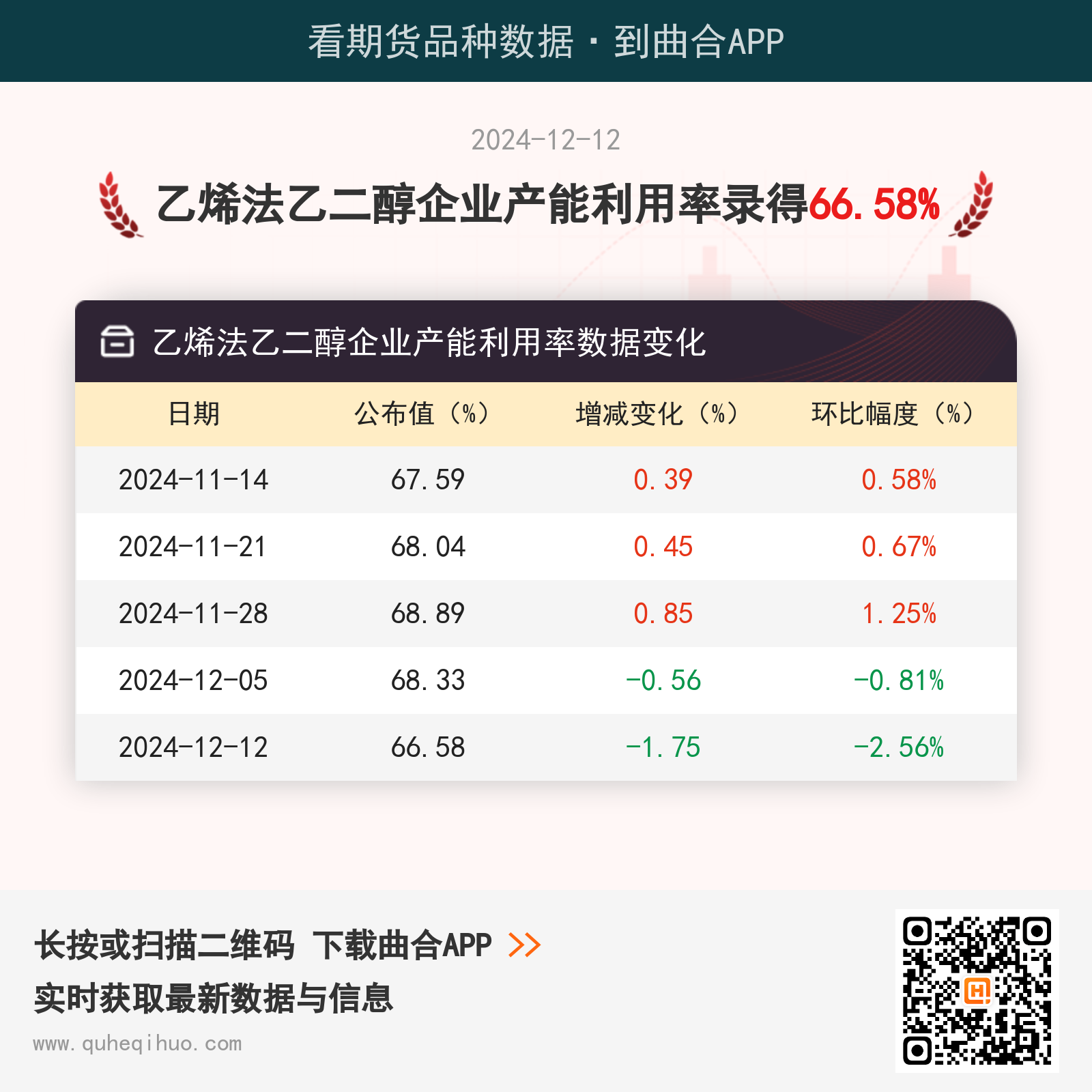 截止12月12日,乙烯法乙二醇企业产能利用率数据为 66.58%,较上一次减少1.75%,环比跌幅2.56%。