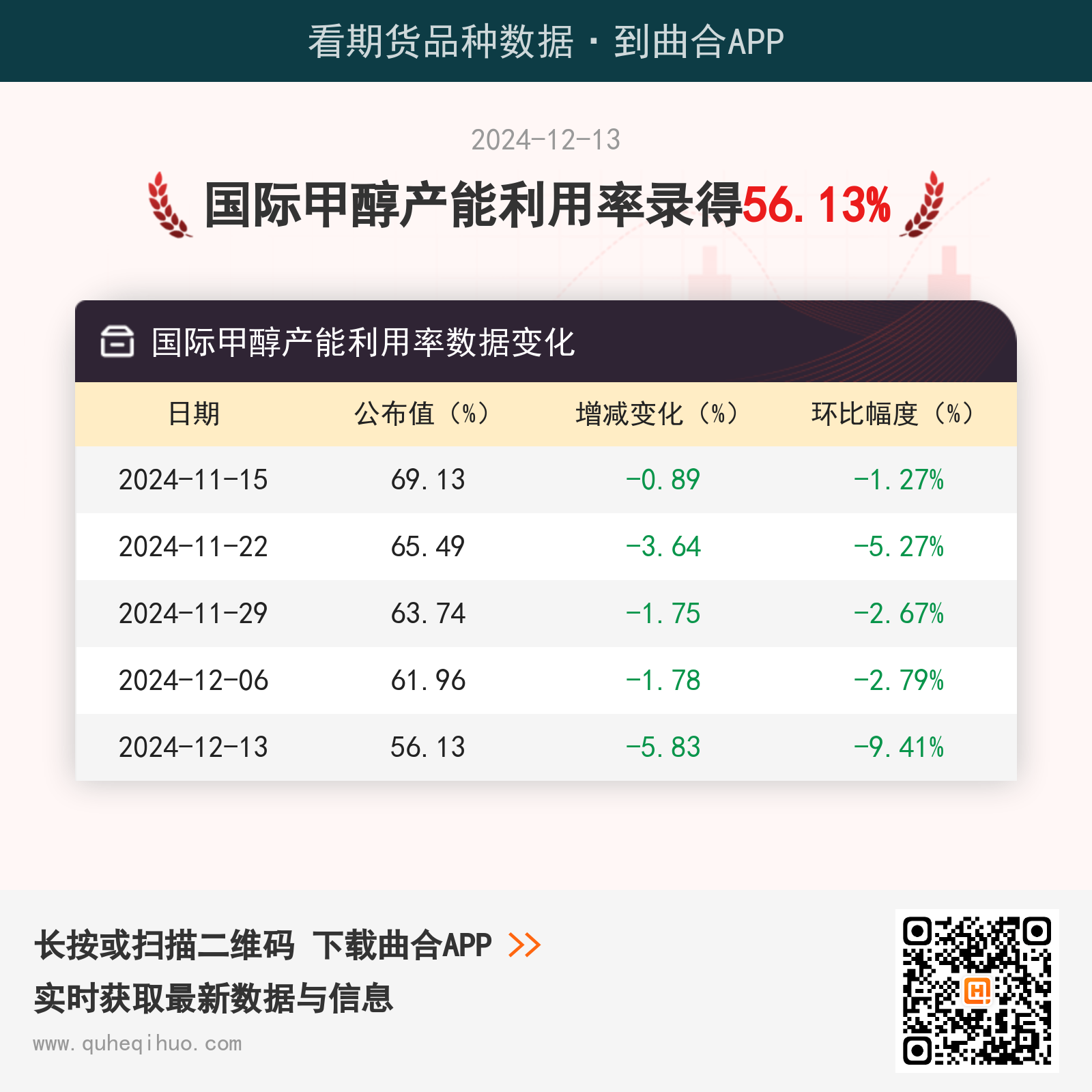 12月13日国际甲醇产能利用率录得56.13% 2024年12月13日 | 查看: 66196 截止12月13日,国际甲醇产能利用率数据录得 56.13%,较上一周减少5.83%,环比跌幅9.41%。图片来源于网络,如有侵权,请联系删除 近期国际甲醇产能利用率数据变化如下: 甲醇期货实时行情 更新时间:---- 最新价 -- 涨跌值 -- 涨跌幅 -- 点击查看甲醇最新行情走势推荐阅读: 人保车险|600余万新能源车主,终于等到你!多家上市银行去年代销保险保费收入同比增长人保车险|为什么车险选择至关重要?为你解析其中的奥秘! 人保车险|保护您和他人,第三者责任险守护安全行驶 人保车险|全险是什么,你知道吗? 人保车险|车险到期未续保损失有多大人保服务|带你了解财产一切险 人保服务|带你了解财产一切险2024年7月5日今日一乙醇胺最新价格查询2024年7月5日最新丁二酸二钠价格行情走势查询 其它推荐 暂无相关文章 关键词: 上一篇:12月13日橡胶期货持仓龙虎榜分析:空方离场情绪强于多方 下一篇:【产量】12月13日国际甲醇产量录得779914吨