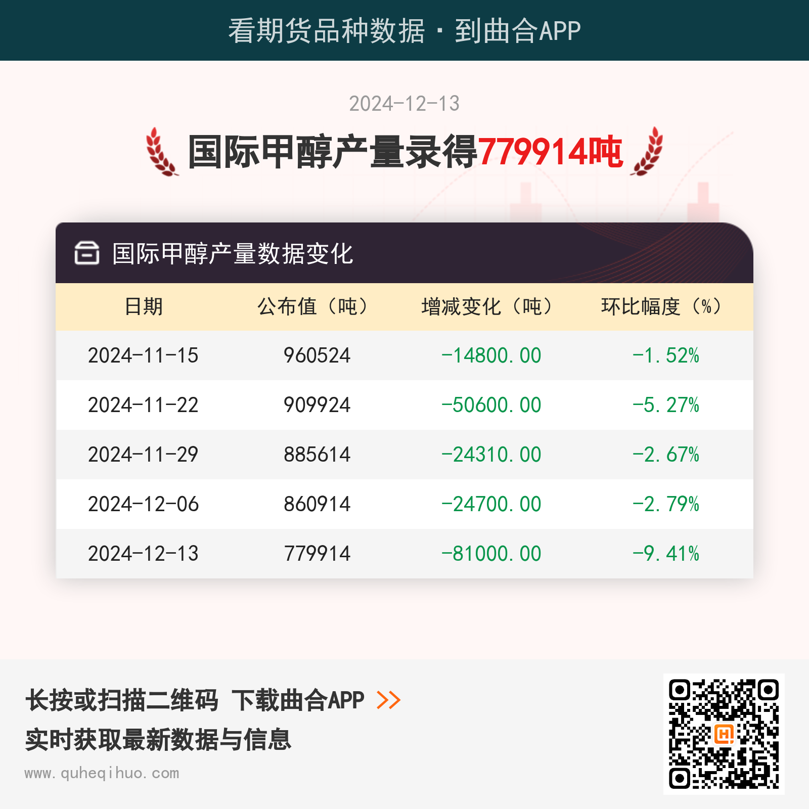 截止12月13日,国际甲醇产量数据录得 779914吨,较上一周减少81000吨,环比跌幅9.41%。