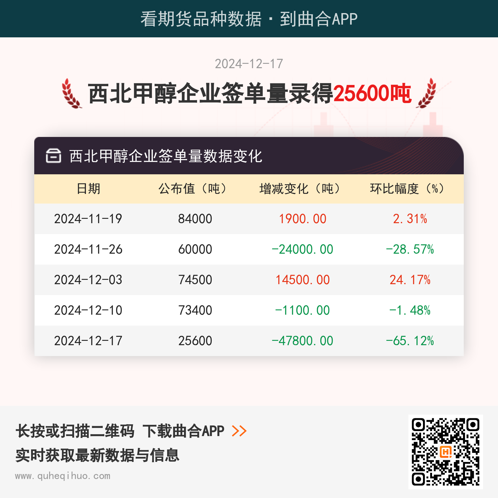 截止12月17日,西北甲醇企业签单量数据录得 25600吨,较上一周减少47800吨,环比跌幅65.12%。
