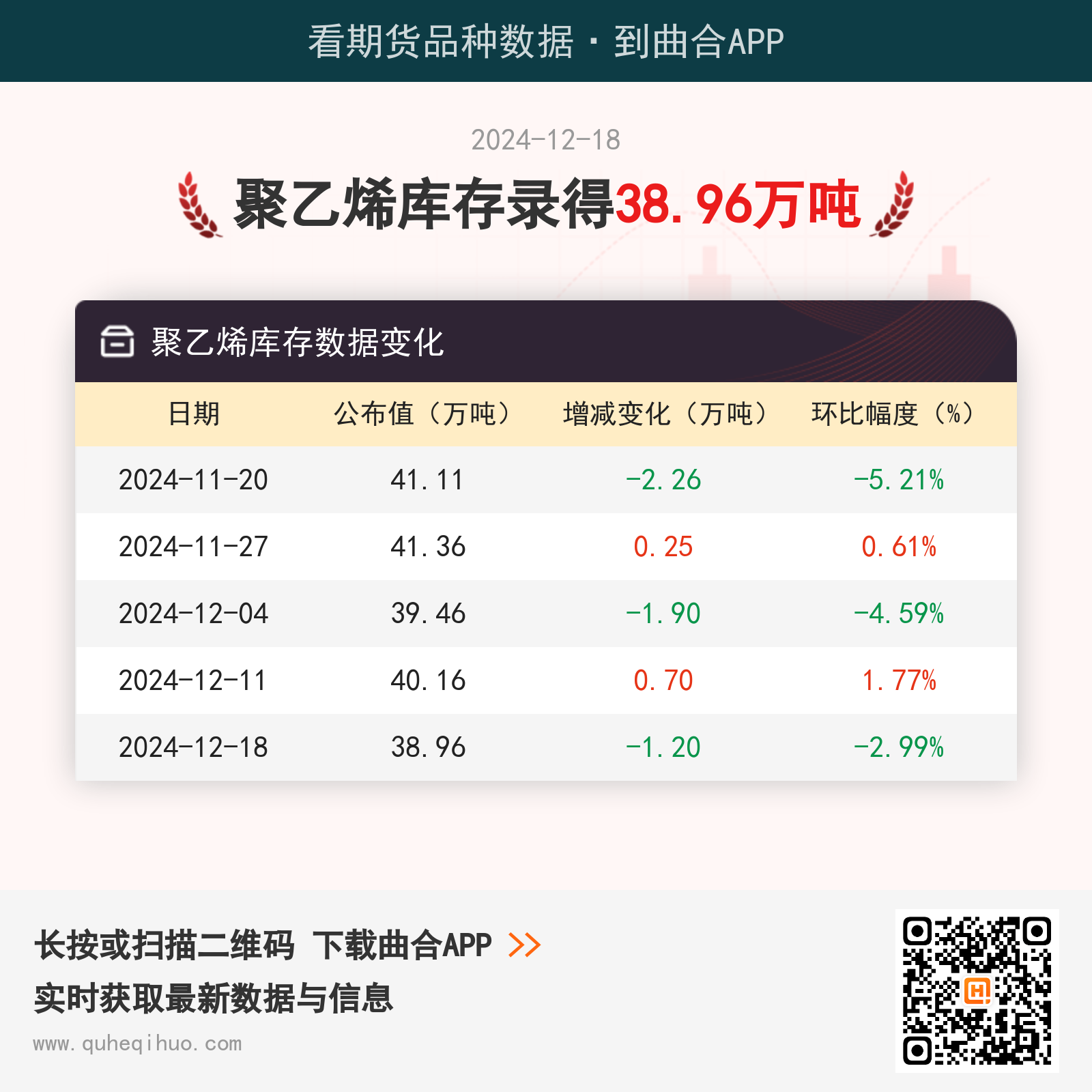 截止12月18日,聚乙烯库存为 38.96万吨,较上一周减少1.20万吨,环比跌幅2.99%。