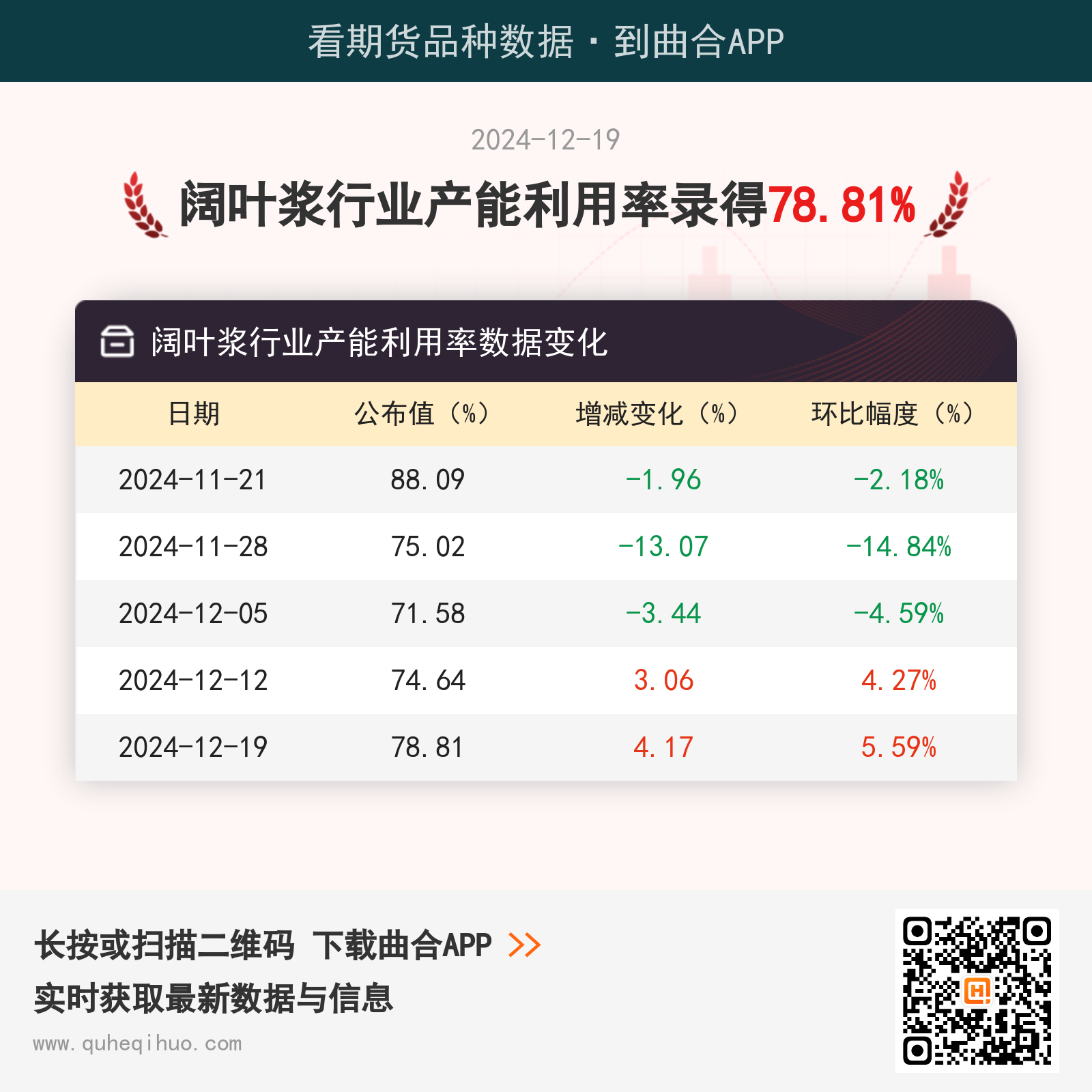截止12月19日,阔叶浆行业产能利用率为 78.81%,较上一周增加4.17%,环比涨幅5.59%。