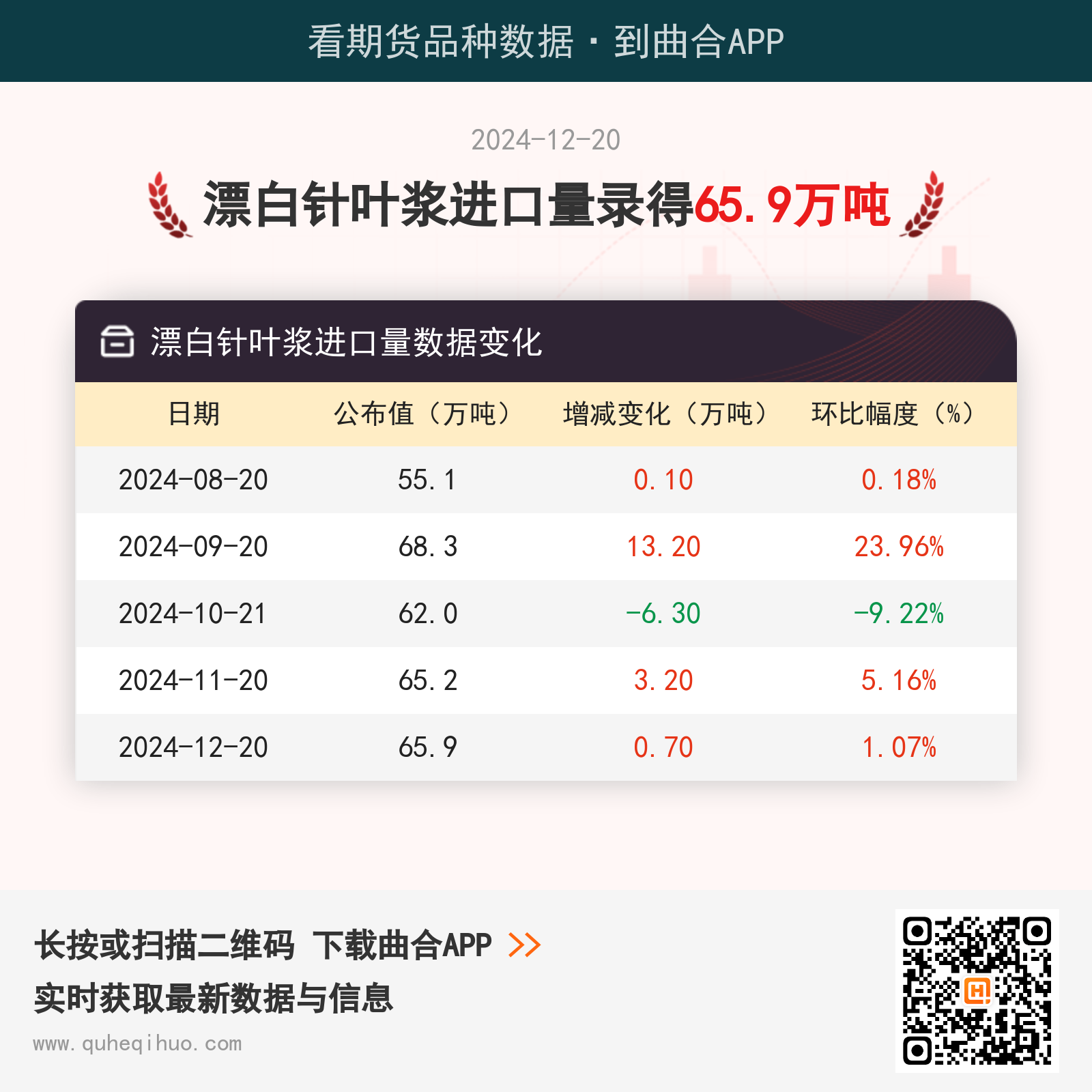 截止12月20日,漂白针叶浆进口量数据录得 65.9万吨,较上一月增加0.7万吨,环比涨幅1.07%。