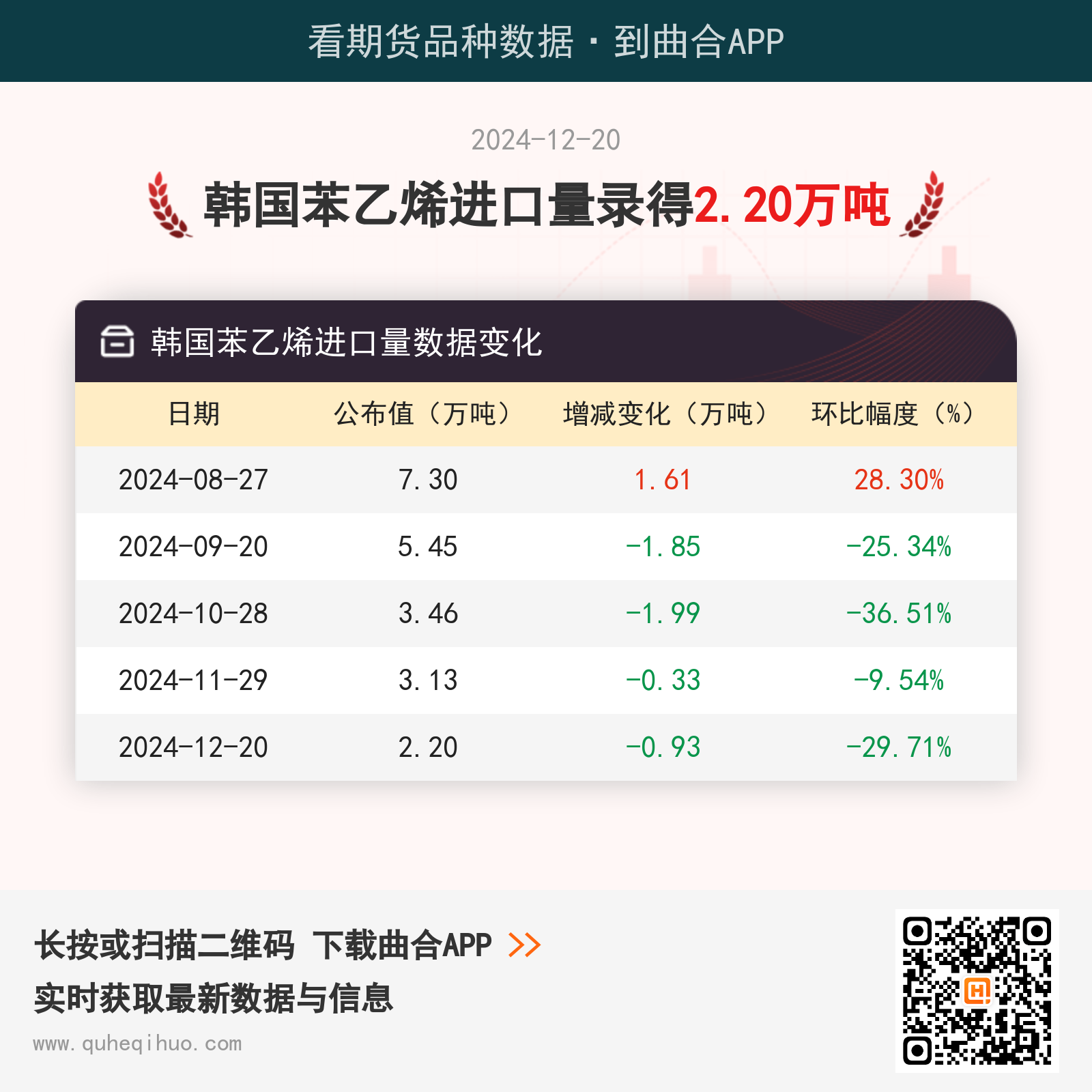 12月20日韩国苯乙烯进口量为2.20万吨 2024年12月20日 | 查看: 67348 截止12月20日,韩国苯乙烯进口量数据录得 2.20万吨,较上一月减少0.93万吨,环比跌幅29.71%。 近期韩国苯乙烯进口量数据变化如下: 图片来源于网络,如有侵权,请联系删除 苯乙烯期货实时行情 更新时间:---- 最新价 -- 涨跌值 -- 涨跌幅 -- 点击查看苯乙烯最新行情走势推荐阅读: 人保车险|机动车商业第三者责任保险知识人保车险|为什么车险选择至关重要?为你解析其中的奥秘! 人保车险|车险到期未续保损失有多大人保服务|带你了解财产一切险 人保服务|带你了解财产一切险2024年7月5日丙烯酸羟丙酯价格行情最新价格查询2024年7月5日今日一乙醇胺最新价格查询2024年7月5日最新丁二酸二钠价格行情走势查询7月5日玻璃期货持仓龙虎榜分析:多空双方均呈进场态势7月5日中国轻纺城成交量 其它推荐 暂无相关文章 关键词: 上一篇:12月20日化机浆进口量为6.9万吨 下一篇:12月20日阔叶木片进口量为141.5万吨
