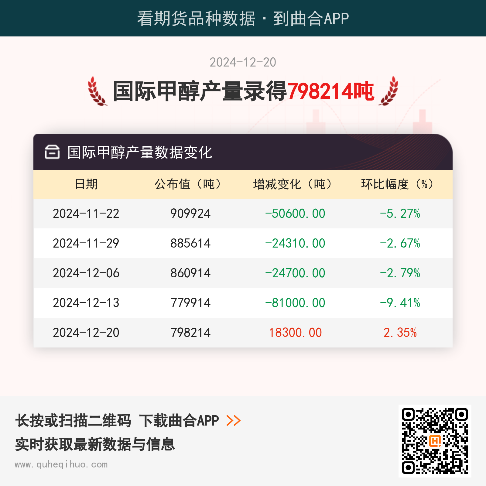 【产量】12月20日国际甲醇产量录得798214吨 2024年12月20日 | 查看: 58440 截止12月20日,国际甲醇产量数据录得 798214吨,较上一周增加18300吨,环比涨幅2.35%。 近期国际甲醇产量数据变化如下:图片来源于网络,如有侵权,请联系删除 甲醇期货实时行情 更新时间:---- 最新价 -- 涨跌值 -- 涨跌幅 -- 点击查看甲醇最新行情走势推荐阅读: 人保车险|常见的车险误区 人保车险|保护您和他人,第三者责任险守护安全行驶 人保车险|新能源车主必看,有关新能源车,你了解多少? 人保车险|全险是什么,你知道吗? 人保车险|车险到期未续保损失有多大人保车险|车险一个不可忽视的行车保障!2024年7月5日丙烯酸羟丙酯价格行情最新价格查询2024年7月5日今日一乙醇胺最新价格查询2024年7月5日烷基酚聚氧乙烯醚(壬基酚聚氧乙烯醚)价格行情今日报价查询2024年7月5日最新丁二酸二钠价格行情走势查询 其它推荐 暂无相关文章 关键词: 上一篇:12月20日国际甲醇产能利用率录得56.10% 下一篇:12月20日聚乙烯表观消费量为345.69万吨