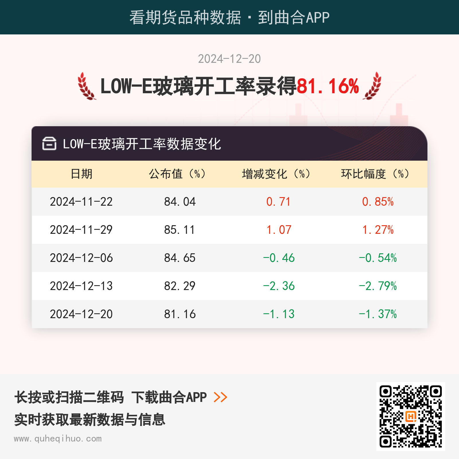 12月20日LOW-E玻璃开工率为81.16% 2024年12月20日 | 查看: 49543 截止12月20日,LOW-E玻璃开工率数据为 81.16%,较上一周减少1.13%,环比跌幅1.37%。图片来源于网络,如有侵权,请联系删除 近期LOW-E玻璃开工率数据变化如下: 玻璃期货实时行情 更新时间:---- 最新价 -- 涨跌值 -- 涨跌幅 -- 点击查看玻璃最新行情走势推荐阅读: 人保车险|常见的车险误区 人保车险|600余万新能源车主,终于等到你!多家上市银行去年代销保险保费收入同比增长 人保车险|保护您和他人,第三者责任险守护安全行驶 人保车险|全险是什么,你知道吗? 人保车险|车险到期未续保损失有多大人保车险|车险一个不可忽视的行车保障!人保服务|带你了解财产一切险2024年7月5日今日一乙醇胺最新价格查询2024年7月5日最新丁二酸二钠价格行情走势查询 其它推荐 暂无相关文章 关键词: 上一篇:12月20日聚乙烯表观消费量为345.69万吨 下一篇:12月20日尿素月度出口量为0.22万吨
