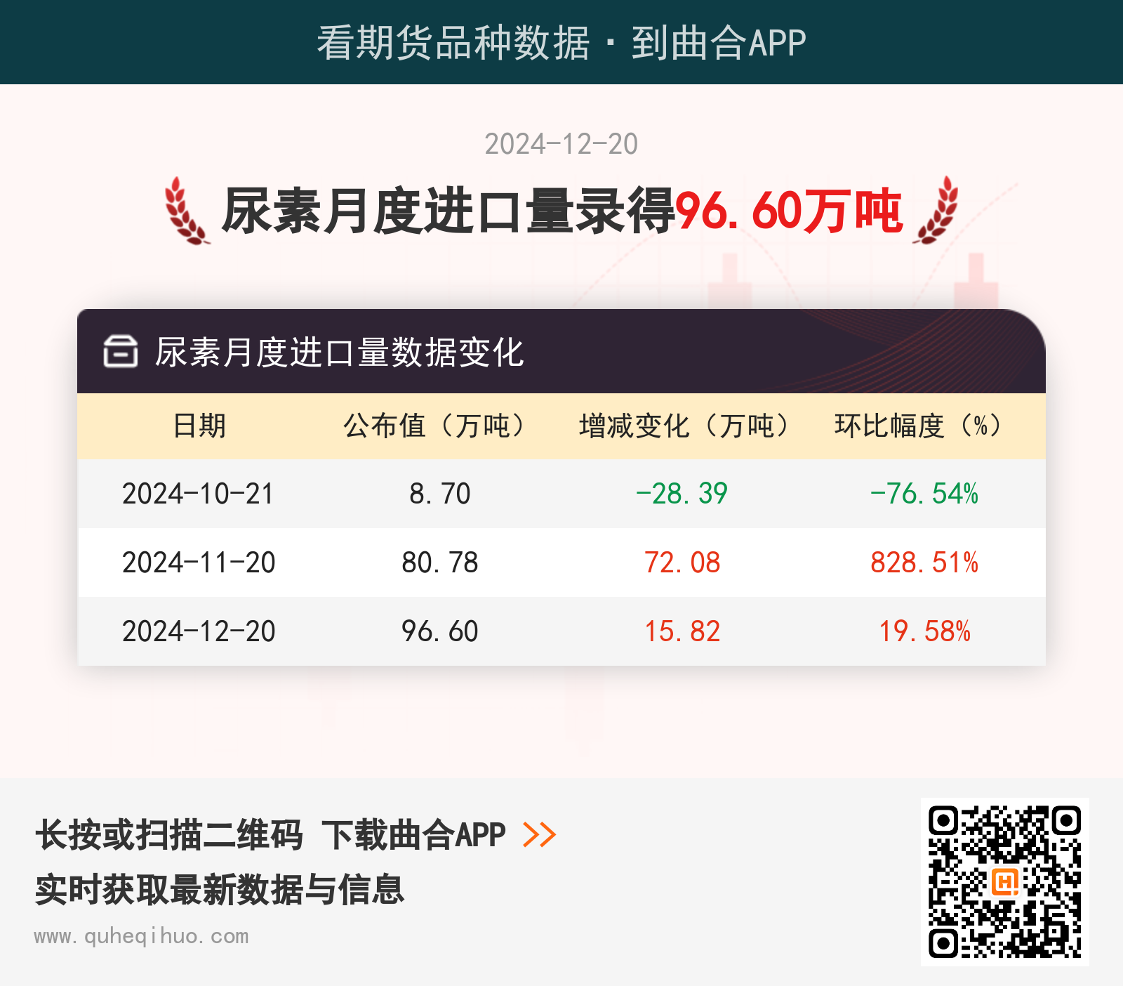 截止12月20日,尿素月度进口量为 96.60吨,较上一月增加15.82吨,环比涨幅19.58%。37.09吨,较上一月增加37.0856吨,环比涨幅842854.55%。
