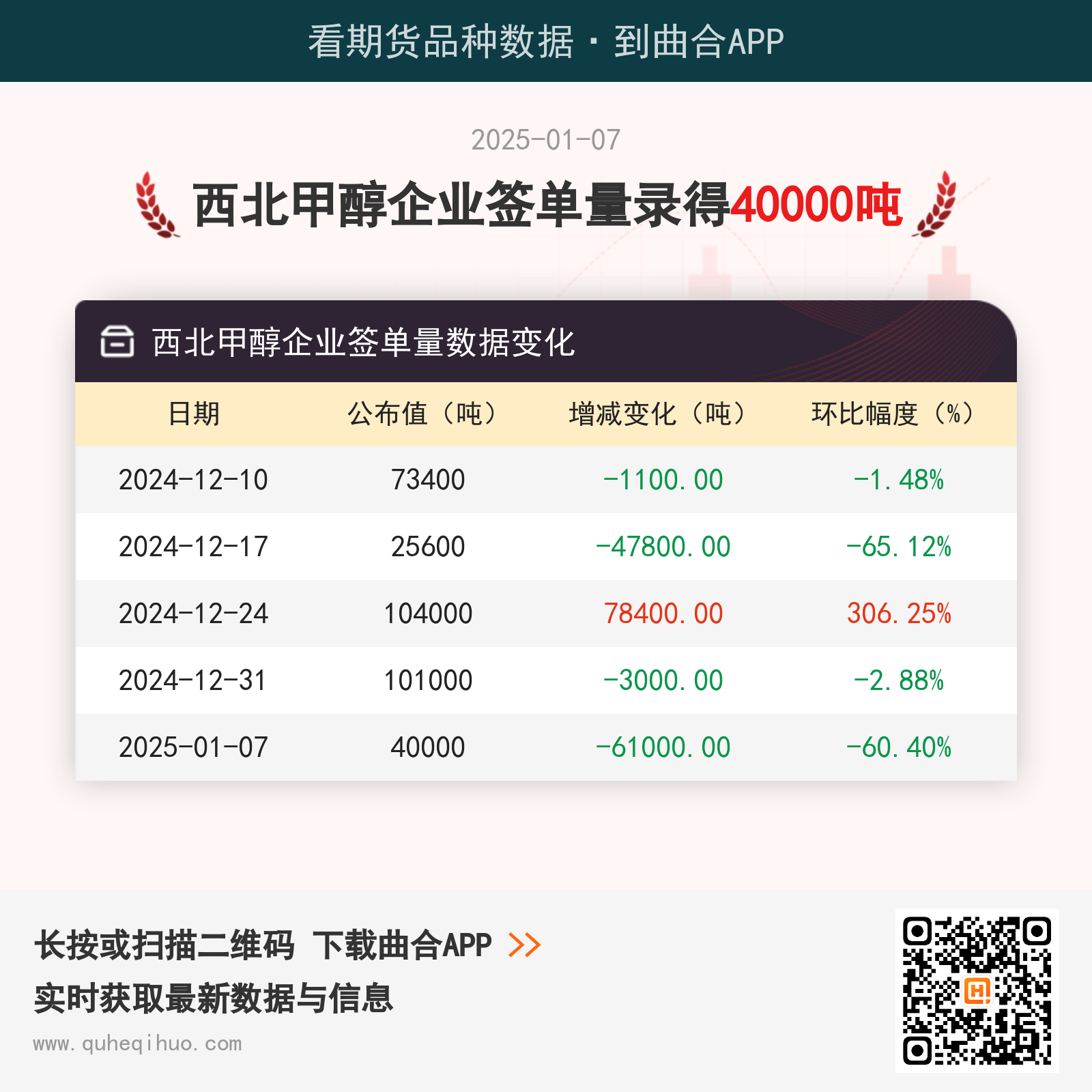 截止1月7日,西北甲醇企业签单量数据录得 40000吨,较上一周减少61000吨,环比跌幅60.40%。