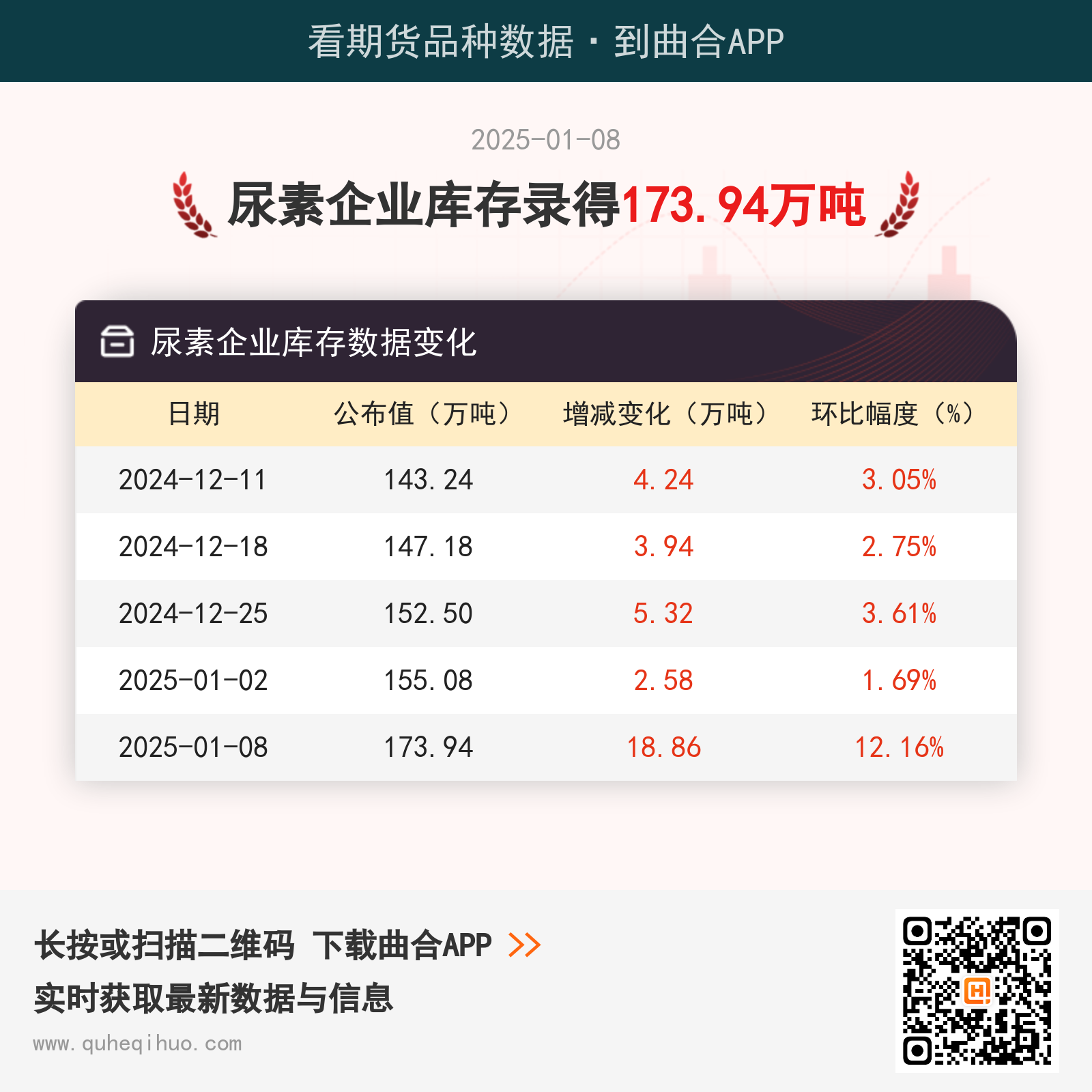 截止1月8日,尿素企业库存为 173.94万吨,较上一周增加18.86万吨,环比涨幅12.16%。