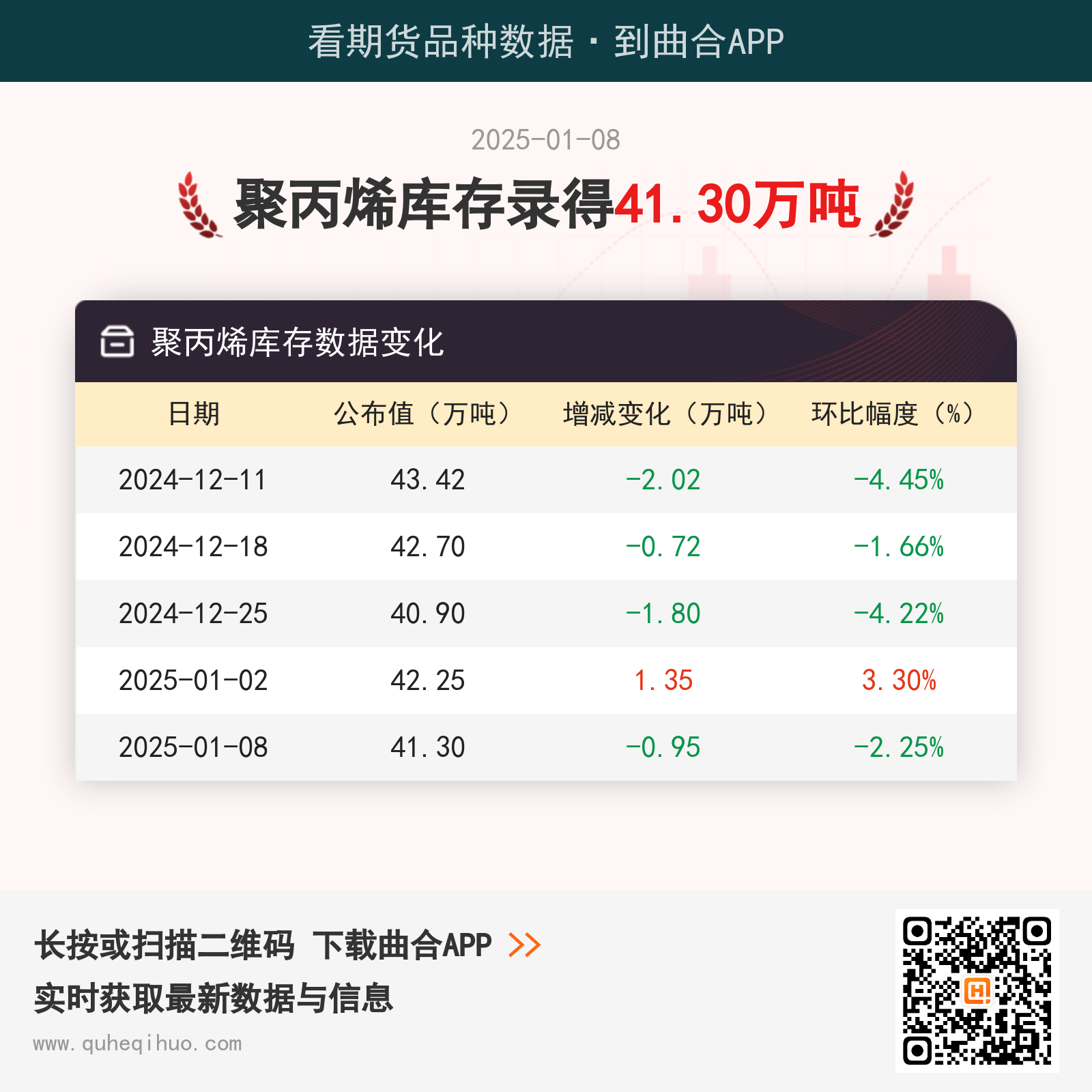 截止1月8日,聚丙烯库存数据录得 41.30万吨,较上一周减少0.95万吨,环比跌幅2.25%。